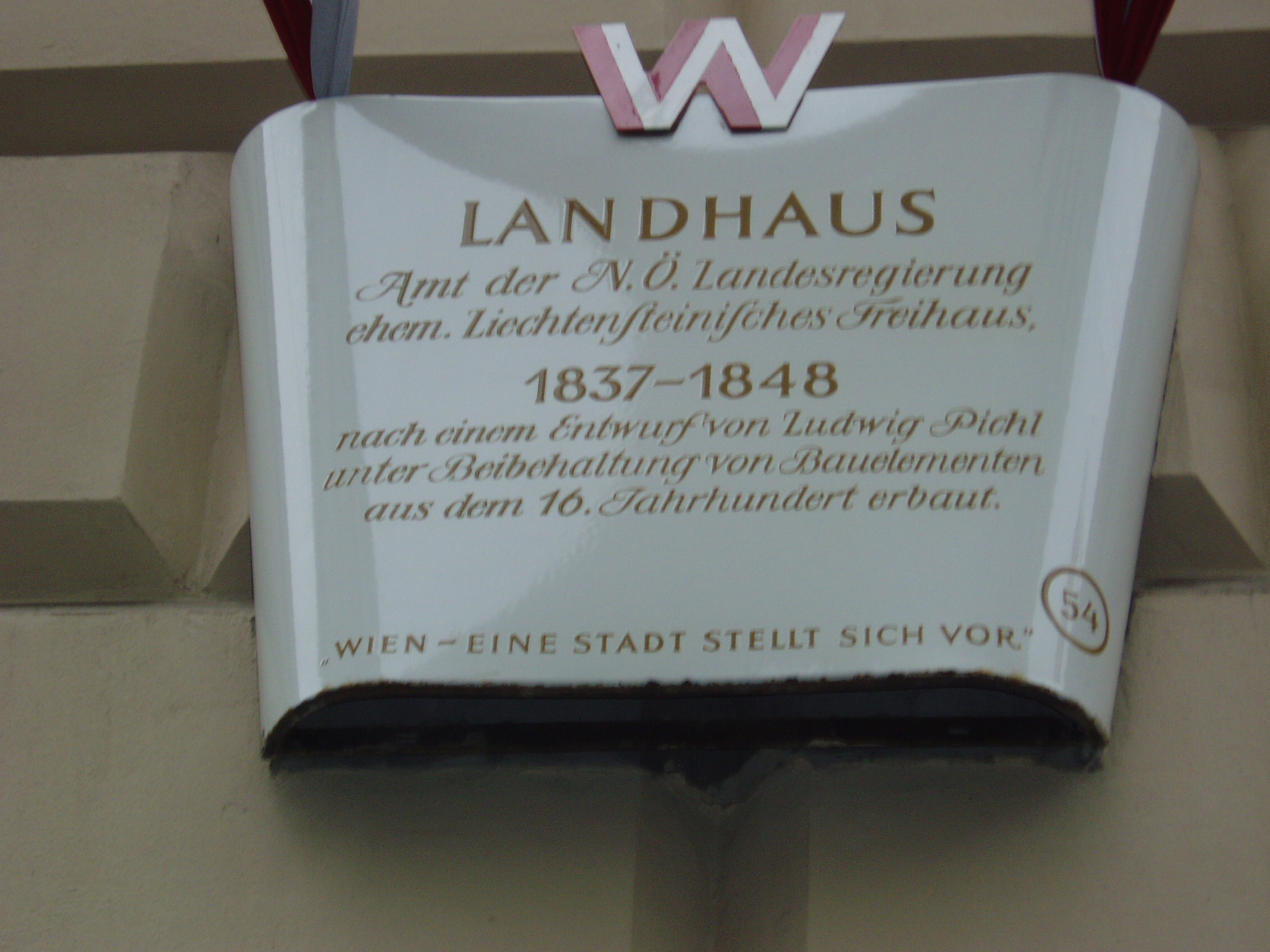 Nyilvános 1569 | 3277 | Herrengasse 13. Landhaus (a régi országház) műemléki táblája | A hatalmas palota építési ideje nem ismert, de az 1500-as években már állt. Azóta többször átépítették, jelenlegi klasszicista köntösét 1832-48 között kapta. Ebben a palotában ült össze évszázadokon keresztül, I. Miksa uralkodása óta az alsó-ausztriai rendi gyűlés. Ma az alsó-ausztriai kormány hivatala. Klasszicista Festsaal-ja (ünnepi terem) nevezetes hangversenyek színhelye volt. Falai között megfordult Schubert, Beethoven, s itt adta első bécsi koncertjét egy 12 éves magyar csodagyermek, Liszt Ferenc. |