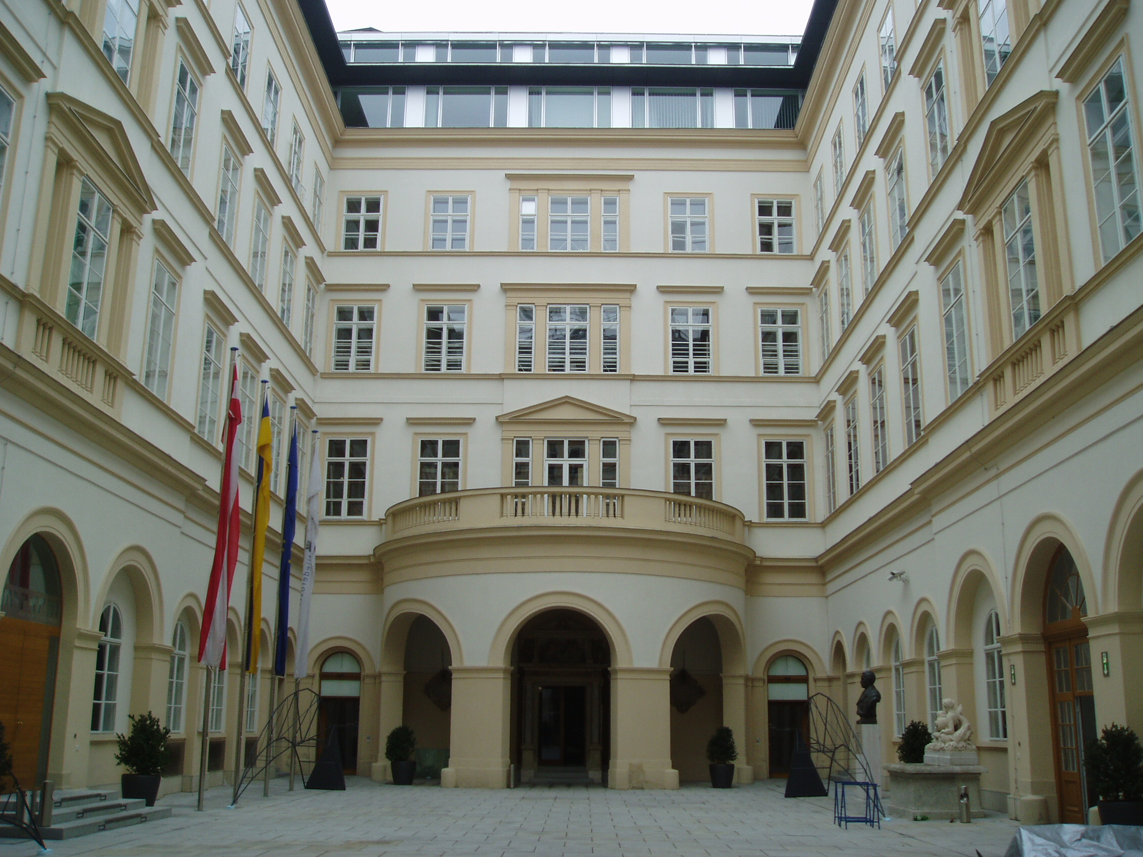 Nyilvános 1609 | 3397 | Herrengasse 13. Landhaus (a régi országház) belső udvara | A hatalmas palota építési ideje nem ismert, de az 1500-as években már állt. Azóta többször átépítették, jelenlegi klasszicista köntösét 1832-48 között kapta. Ebben a palotában ült össze évszázadokon keresztül, I. Miksa uralkodása óta az alsó-ausztriai rendi gyűlés. Ma az alsó-ausztriai kormány hivatala. Klasszicista Festsaal-ja (ünnepi terem) nevezetes hangversenyek színhelye volt. Falai között megfordult Schubert, Beethoven, s itt adta első bécsi koncertjét egy 12 éves magyar csodagyermek, Liszt Ferenc. |