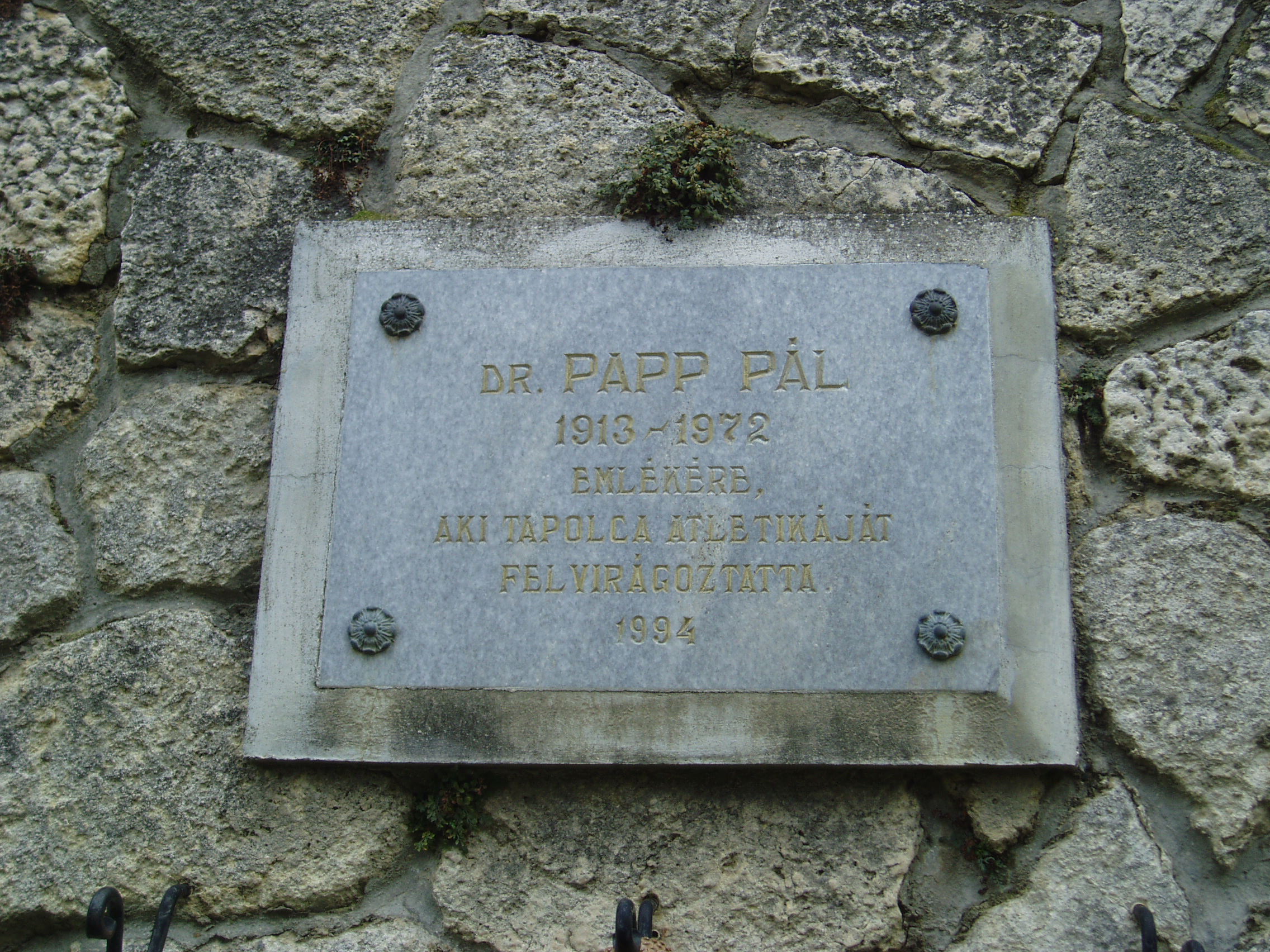 Nyilvános 1108 | 1754 | Tapolca, Városi Panteonfal: Papp Pál emléktáblája | A Malom–tó mögött álló magas kőfal a Városi Panteonfal, amelyen több neves, tapolcai kötődésű személyiségnek állítottak emléktáblát. Dr. Papp Pál (1913-1972) atlátaedző Tapolca sportéletének jeles alakja, felvirágoztatója volt. A felvétel 2007 februárjában készült. Felh. irod.: Bándi László: Emlékhelyek Veszprém megyében. Veszprém, 1996 www.tapolca.hu |