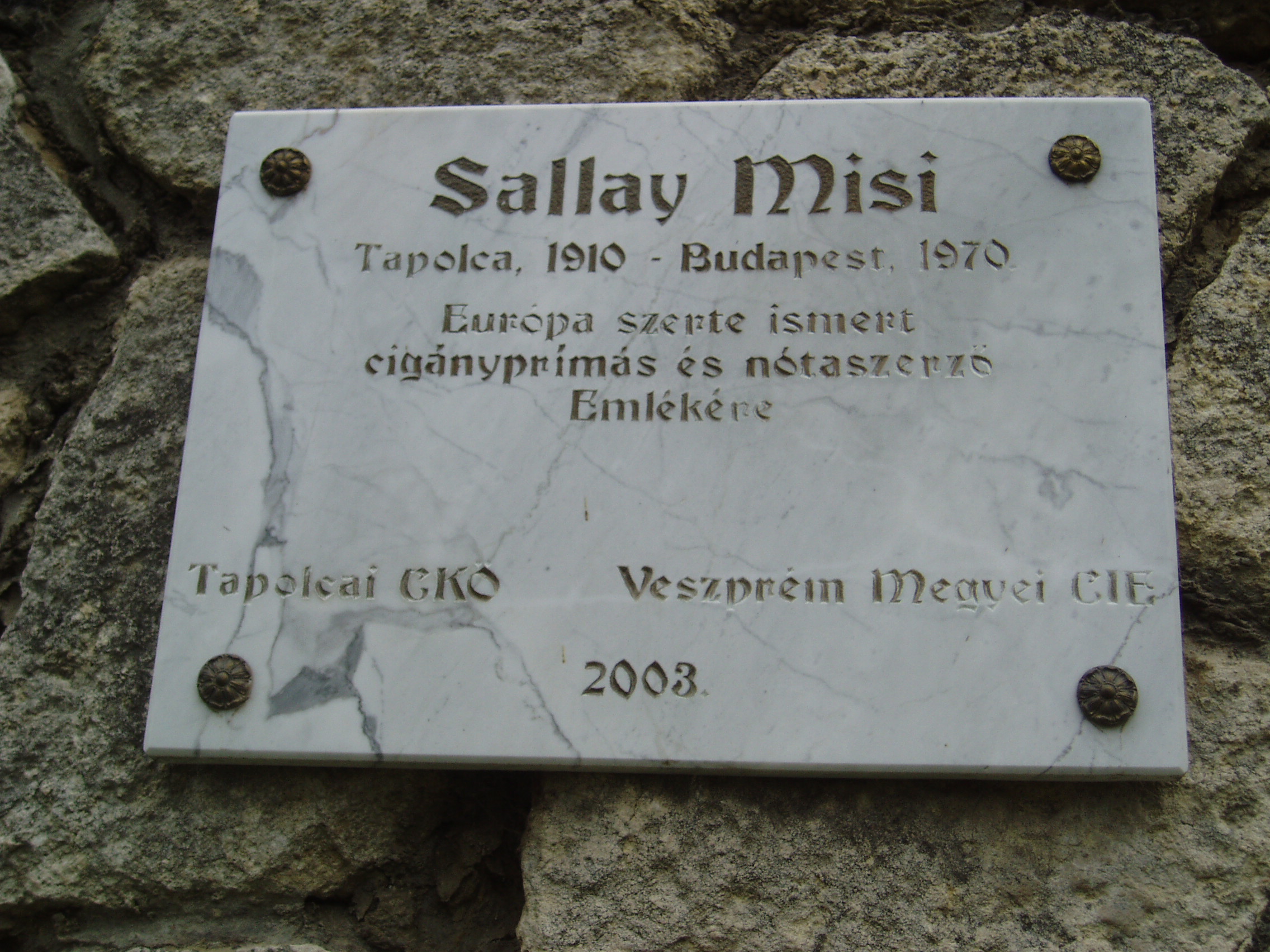 Nyilvános 1119 | 2051 | Tapolca, Városi Panteonfal: Sallai Misi emléktáblája | A Malom–tó mögött álló magas kőfal a Városi Panteonfal, amelyen több neves, tapolcai kötődésű személyiségnek állítottak emléktáblát. Sallai Misi (1910-1970) Európa-szerte híres cigányprímás Tapolcán született. Emléktábláját 2003-ban avatták fel. (A szakirodalom szerint vezetéknevét i-vel írta, ezen az emléktáblán viszont Sallay alakban szerepel.) A felvétel 2007 februárjában készült. Felh. irod.: Bándi László: Emlékhelyek Veszprém megyében. Veszprém, 1996 www.tapolca.hu |