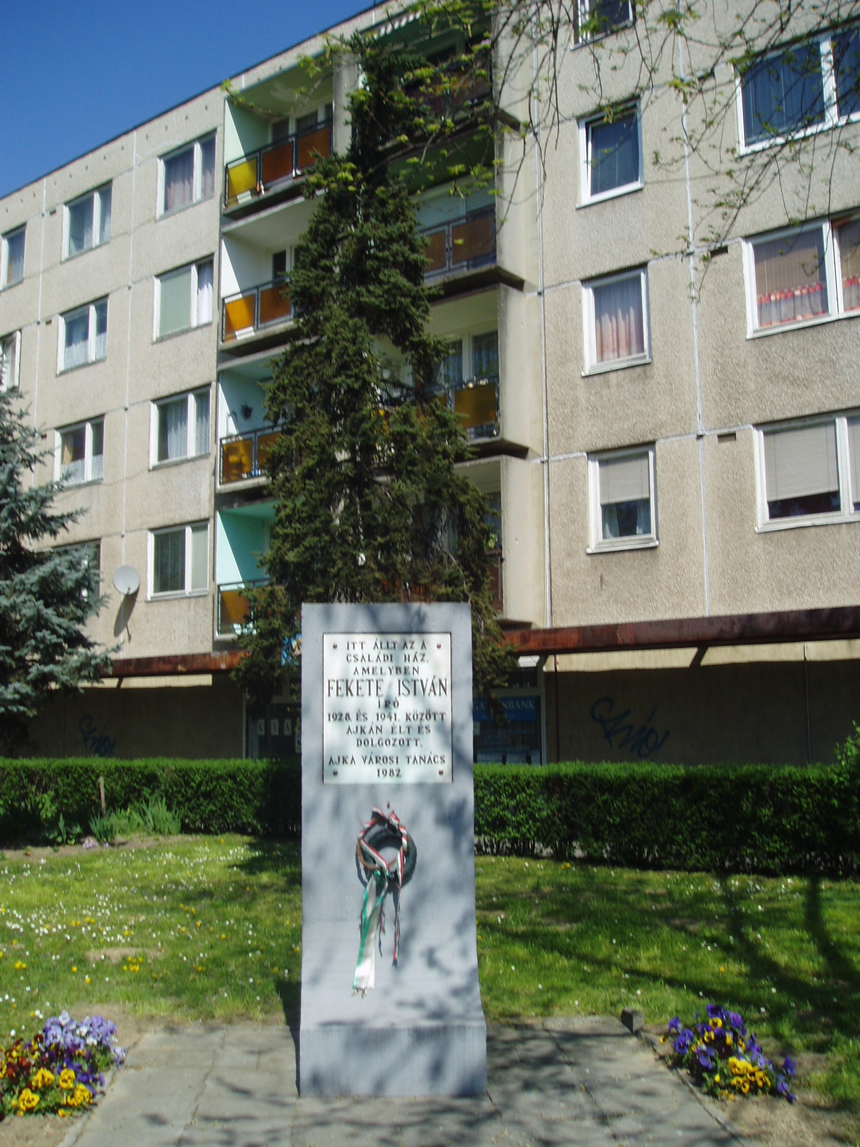 Nyilvános 1498 | 3490 | Ajka, Fő utca 1. | Itt állt egykor az a háromszobás családi ház, amelyben Fekete István író 1929 és 1941 között élt és alkotott (az emlékművön az 1928-as évszám szerepel) . Fekete István Nirnsee Ferenc ajkai földbirtokos uradalmában kapott intézői állást. Közvetlenül az esküvő után, friss házasként költözött ide feleségével, Piller Edittel az egykori szolgálati lakásba. Intézői, gazdatiszti munkája mellett itt kezdett el írni. Első írásait a Kittenberger Kálmán szerkesztette Nimród című lapnak küldte. Ajkán írta 1936-ban A koppányi aga testamentuma című regényét, amely a Gárdonyi Géza Társaság pályázatának első díjasa lett. 1939-ben készült el Csí című állatregényével. 1939-ben jelent meg az ugyancsak itt írt Zsellérek című regénye. 1940-ben a Kisfaludy Társaság tagjává választották, a következő évben pedig állást kapott a Földművelődésügyi Minisztériumban és családjával a fővárosba költözött. Ajkai gazdatiszti éveit, a természeti és társadalmi környezetet örökítette meg Bogáncs című regényében. Részben itt játszódnak a Köd, az Őszi vásár és a Téi berek című művei. Az 1947-ben megjelent Gyeplő nélkül című regényében egy volt ajkai nagybirtok pusztulásának történetét örökítette meg. Egykori szolgálati lakásában emlékszobát rendeztek be, amely ma a Városi Múzeumban tekinthető meg a Molnár Gábor Emlékszobával együtt (Ajka, Szabadság tér 4.) . A Városligeti Csónakázó tó kis szigetén Fekete István emlékhelyet alakítottak ki. Borsos Miklós által készített bronz mellszobra körül láthatók az író állattörténeteinek szereplői, amelyeket Samu Katalin mintázott meg: közülük Kele, Csí, Hu és Bogáncs. A fénykép 2007 áprilisában készült. Erős Zoltán: Magyar irodalmi helynevek A-tól Z-ig. Bp., Kis-Lant Kiadó, 1995 www.ajka.hu |