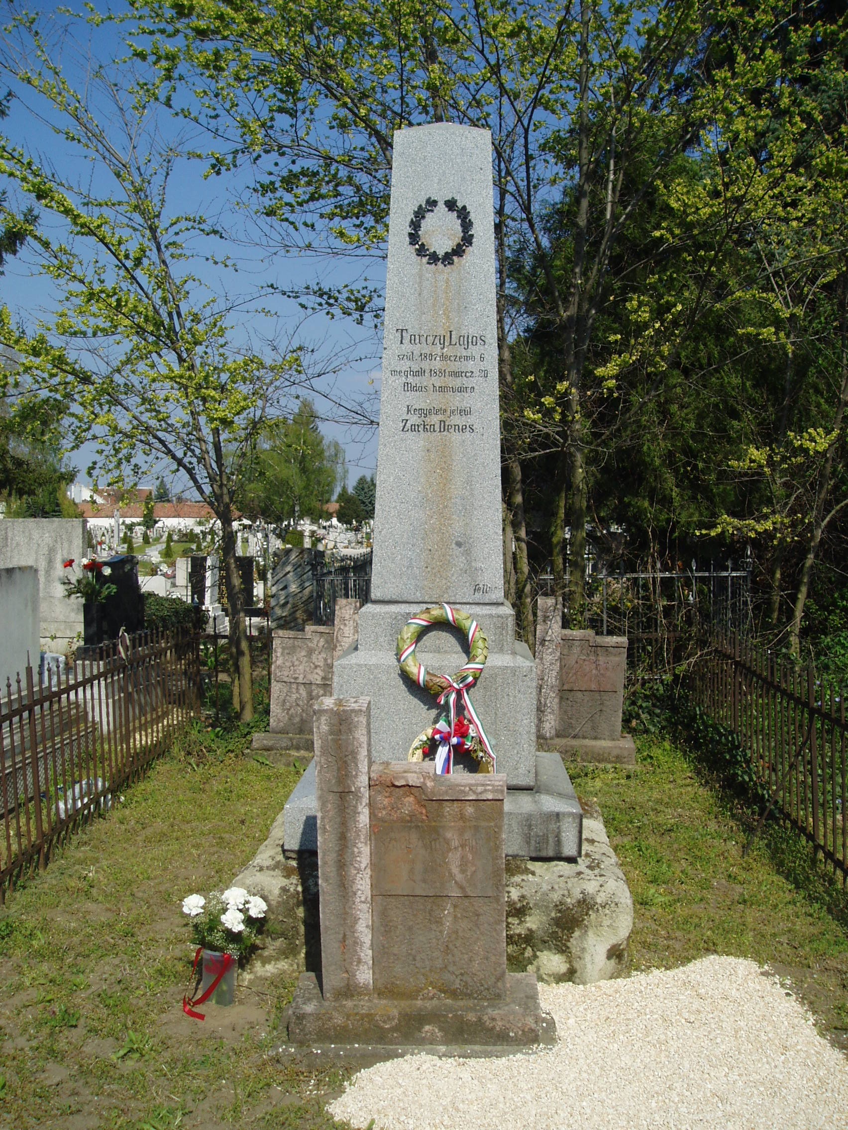 Nyilvános 1563 | 6198 | Pápa, Alsóvárosi temető: Tarczy Lajos sírja | A Jókai utcáról nyíló Temető utca vezet a XIX. század elején megnyílt Alsóvárosi köztemetőbe. A város sok neves személyiségének van itt a sírja. Itt nyugszik Tarczy Lajos (Hetény, 1807. dec. 6. – Bécs, 1881. márc. 20.) író, természettudós, tanár. Bölcseleti tanulmányait Pápán végezte. 1833-tól a református kollégium tanára, később annak egyik újjáteremtője. Elsőként hirdette magyar katedráról a hegeli eszméket. Nézetei miatt később le kellett mondania a filozófia tanításáról. Egyénisége maradandó hatással volt irodalmunk számos későbbi kiválóságára, Petőfire, Jókaira, Eötvös Károlyra. Az MTA 1838-ban levelező-, 1840-ben rendes taggá választotta. 1841-től 1844-ig a Képzőtársaság elnöke. Előszót írt a Tavasz című zsebkönyvhöz (1845), amely Petőfi és Jókai írásait is tartalmazta. Termékeny volt Széchenyi Istvánhoz fűződő barátsága, ösztönzést adott pápai 25 holdas mintagazdaságának kialakításához. Emlékét tábla őrzi volt lakása, a Jókai utca 26. számú ház falán. A fénykép 2007 áprilisában készült. Felh. irod.: Németh Adél - Szabó Lajos: Pápa. Bp. Panoráma, 1989 Veszprém megyei életrajzi lexikon. Veszprém, Veszprém Megyei Önkormányzat Közgyűlése, 1998 |