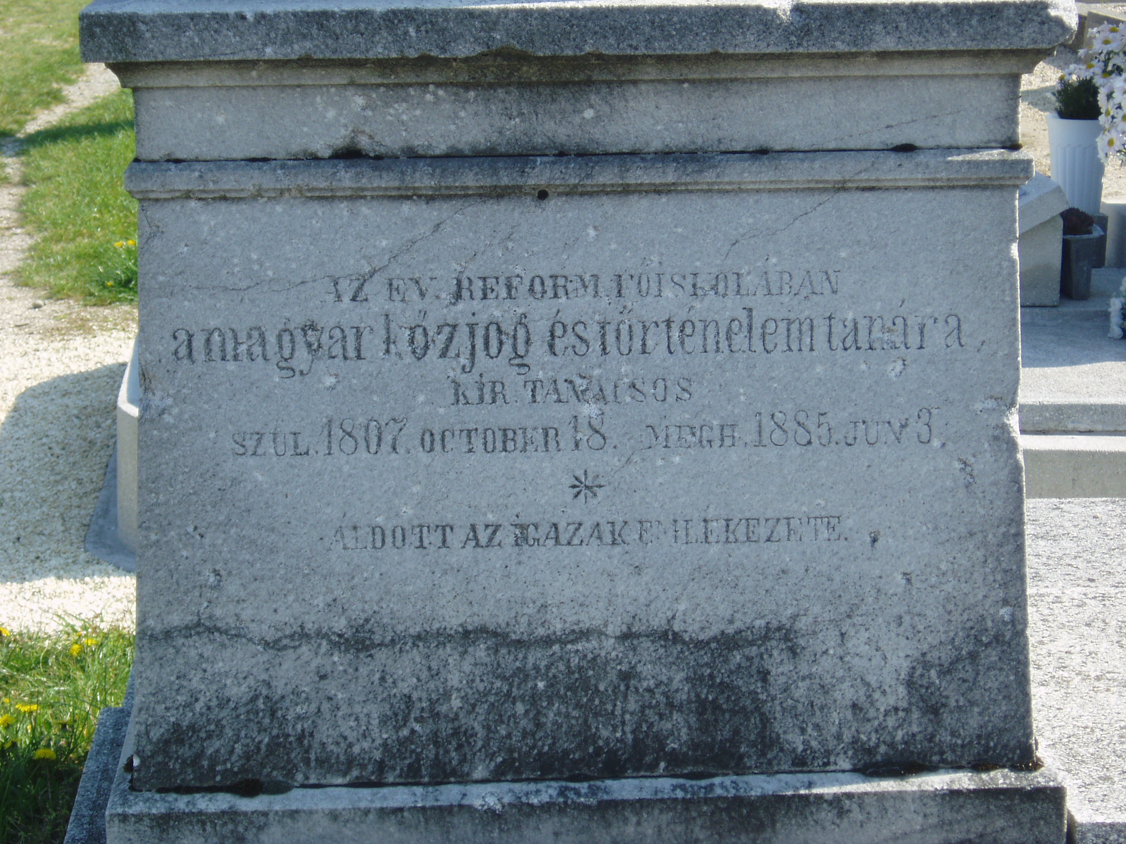 Nyilvános 1491 | 3584 | Rövid leírás | Teljes leírás (1.43 KB) | Pápa, Alsóvárosi temető: Bocsor István sírja A Jókai utcáról nyíló Temető utca vezet a XIX. század elején megnyílt Alsóvárosi köztemetőbe. A város sok neves személyiségének van itt a sírja. Itt nyugszik Bocsor István (Enying, 1807. okt. 18. – Pápa, 1885. jún. 3.) író, tanár. Enyingi jobbágycsalád sarja. 1819-1832 között Pápán tanult, a református főiskolán teológiai és jogi képesítést nyert, majd 1837-től tanított. Magyar nyelvű történelemórái a város közönségére is nagy hatást gyakoroltak. 1848-ban az enyingi kerület nemzetgyűlési képviselője volt. A szabadságharc bukása után visszavonultan, tanári munkásságának élt. Alakját Kozma Andor: A karthágói harangok c. versében örökítette meg. Latin nyelvtana öt kiadást ért meg. Pápán a Széchenyi u. 10. sz. házon – ahol lakott – emléktáblája, a Dunántúli Ref. Egyházkerület Könyvtárában (Pápa, Március 15. tér 9.) mellszobra van. Radikalizmusáról tanúskodó, előadásait tartalmazó Világtörténelem (1841) című, illetve Középkori történetek (1863–1864.) című kézirata is ebben a gyűjteményben található. A fénykép 2007 áprilisában készült. Felh. irod.: Németh Adél - Szabó Lajos: Pápa. Bp. Panoráma, 1989 Veszprém megyei életrajzi lexikon. Veszprém, Veszprém Megyei Önkormányzat Közgyűlése, 1998 |