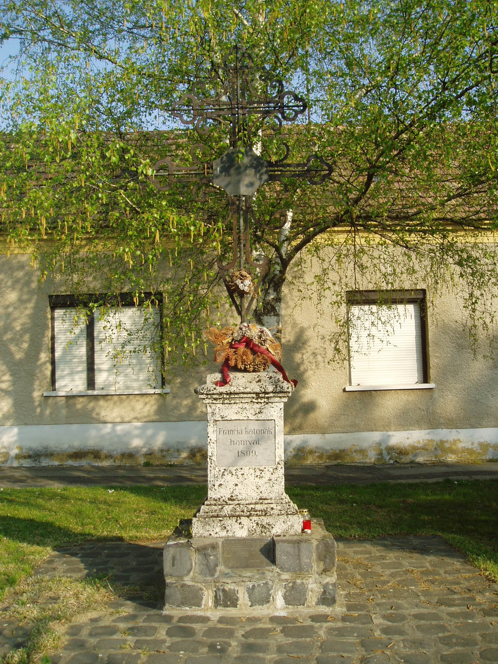 Nyilvános 1226 | 2154 | Pápa, Anna tér: Francia kereszt | Az Anna tér az egykori Alsóváros településközpontja. A tér dombján álló Szent Anna kápolna 1875-ben épült. A közelében található ún. Francia kereszt a napóleoni háború francia halottainak egykori tömegsírja felett áll. Pápát 1809. június 1. és július 6. között megszállva tartották a franciák. A hátrahagyott, majd később idehozott sebesültek ápolásáról a városnak és a megyének kellett gondoskodni. Egyes források szerint több, mint 5000 sebesültet ápoltak a városban, akik közül sokan belehaltak sérüléseikbe. Őket itt, az Anna téren temették el. Hamvaik a temető felszámolása után az Alsóvárosi temetőbe kerültek a kettős vaskereszttel együtt, amelyet 1986-ban állítottak vissza eredeti helyére. A fénykép 2007 áprilisában készült. Felh. irod.: Németh Adél - Szabó Lajos: Pápa. Bp. Panoráma, 1989 |