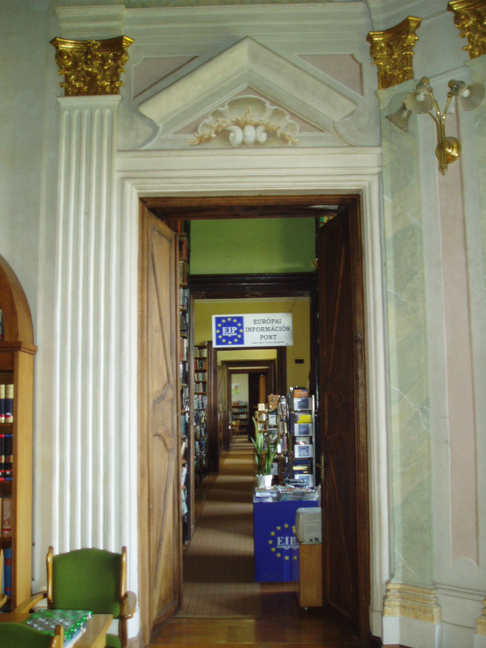 Nyilvános 1141 | 1983 | Pápa, Fő tér 1-3. Esterházy-kastély | A barokk kastély a korábban itt állott végvár helyére épült, részben annak alapfalai, kövei felhasználásával. A régi várat az 1740-es évektől Esterházy Ferenc (1683–1754) tárnokmester kezdte átalakítani Franz Anton Pilgram tervei alapján. A barokk várkastély kialakítása 1784-re fejeződött be Esterházy Ferenc fia, Eszterházy Károly egri püspök idejében Fellner Jakab, majd Grossmann József vezetésével. Az U alakú, egyemeletes épület a versailles-i palota nyomán elterjedt francia kastélytípus képviselője. Az épület keleti szárnyának emeletén volt a kastély kápolnája. Az 1988/89-ben végzett restaurálás eredményeképpen ma újra megcsodálható a helyiség eredeti architektúrája és Joseph Ignaz Mildorfer 1750 körül festett mennyezetképe, amely Krisztus mennybemenetelét ábrázolja. A kápolnában, amelynek példaszerű felújításáért a város 1990-ben Europa Nostra díjat kapott, ma a Jókai Mór Városi Könyvtár olvasóterme működik. A fénykép 2007 áprilisában készült. Felh. irod.: Németh Adél - Szabó Lajos: Pápa. Bp. Panoráma, 1989 Pápa. Szerk. Sz. Farkas Aranka. Bp., Magyar Képek, 2000 |