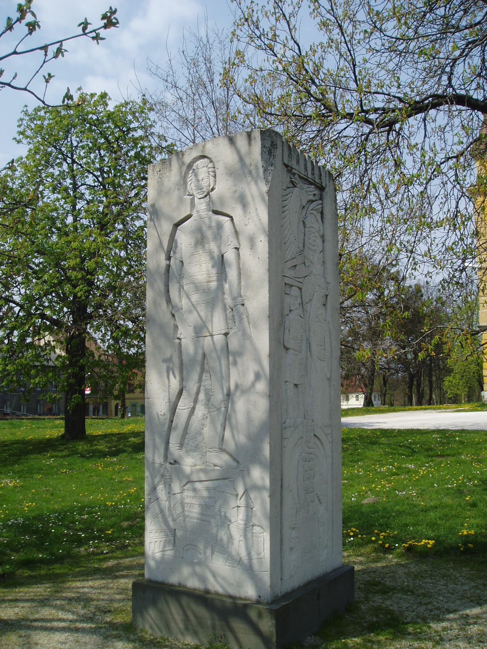 Nyilvános 1179 | 1824 | Pápa, Fő tér 1-3. Jókai-oszlop | Az Esterházy kastély előtti, a Fő tér felé néző parkban két egykori pápai diák - Jókai Mór és Petőfi Sándor - emlékére állított szoborkompozíció áll. Jókai Mór emlékoszlopa Szervátiusz Jenő és Szervátiusz Tibor alkotása. A négyzetes hasáb alakú mű felületét Jókai Mór és regényalakjainak domborműves ábrázolásai borítják. A fénykép 2007 áprilisában készült. Felh. irod.: Németh Adél - Szabó Lajos: Pápa. Bp. Panoráma, 1989 |
