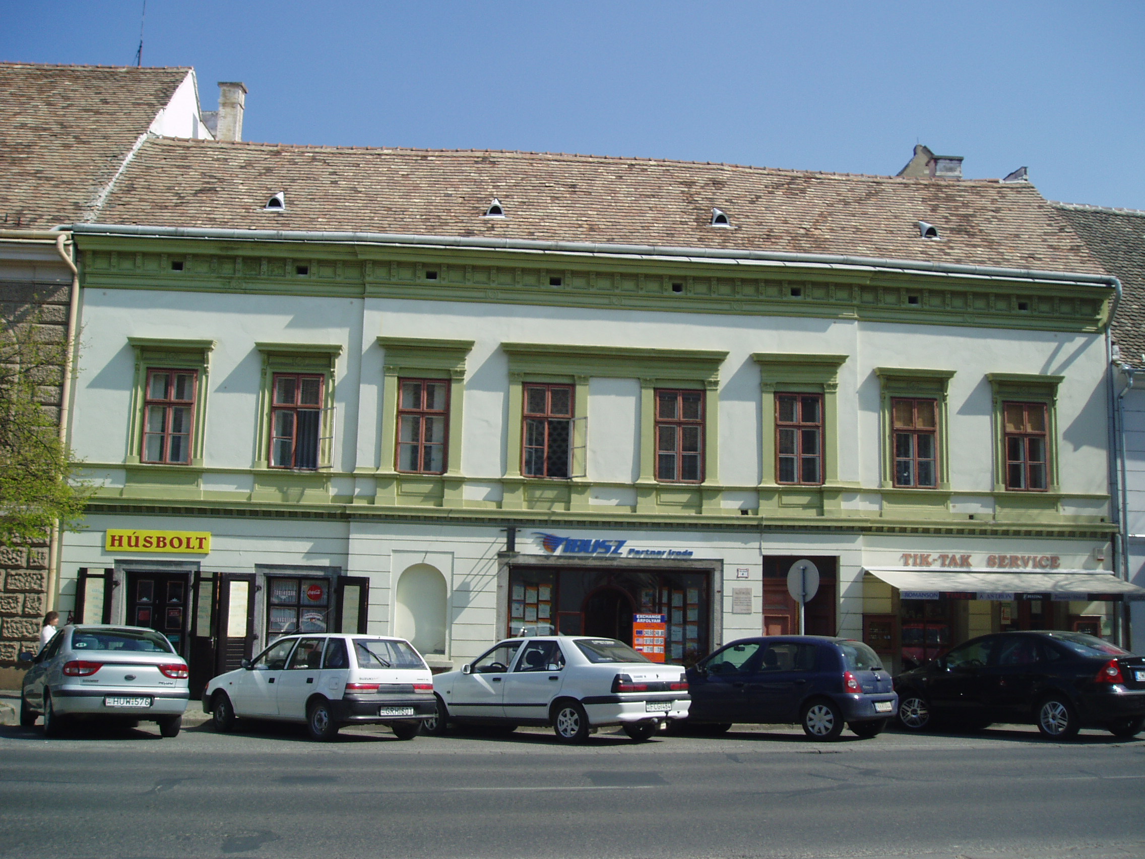 Nyilvános 1159 | 1688 | Pápa, Fő utca 4. | A Baranyay, illetve azt megelőzően Eőry-Szabó-féle ház egyemeletes, U alaprajzú lakóház. 1760 körül épült barokk stílusban. Romantikus arculatát 1850 kürül nyerte el. Rendkívül hangulatos udvara van. Udvarán - és a Fő utca 6. számú ház udvarán - áll a Református Ótemplom, azon a helyen, ahol 1718-1752 között egy fészer szolgált az istentisztelet helyszínéül. Az ótemplom felépítését II. József türelmi rendelete tette lehetővé 1783-ban. A rendeletben előírtak betartásával a templom nem az utca homlokzatvonalában, hanem zárt udvaron és torony nélkül épülhetett csak fel. A templom a késő barokk - kora klasszicista stílusú református templomok legkorábbi képviselője. 1972-ben nyitották meg benne a Református Egyháztörténeti Múzeum kiállítását. Sajnos jelenleg (2007. április) sem az épület, sem a kiállítás nem látogatható "takarékossági okok" miatt (fényképet sem tudtam róla készíteni, csak az utcafrontról: K. K.). A fénykép 2007 áprilisában készült. Felh. irod.: Németh Adél - Szabó Lajos: Pápa. Bp. Panoráma, 1989 |