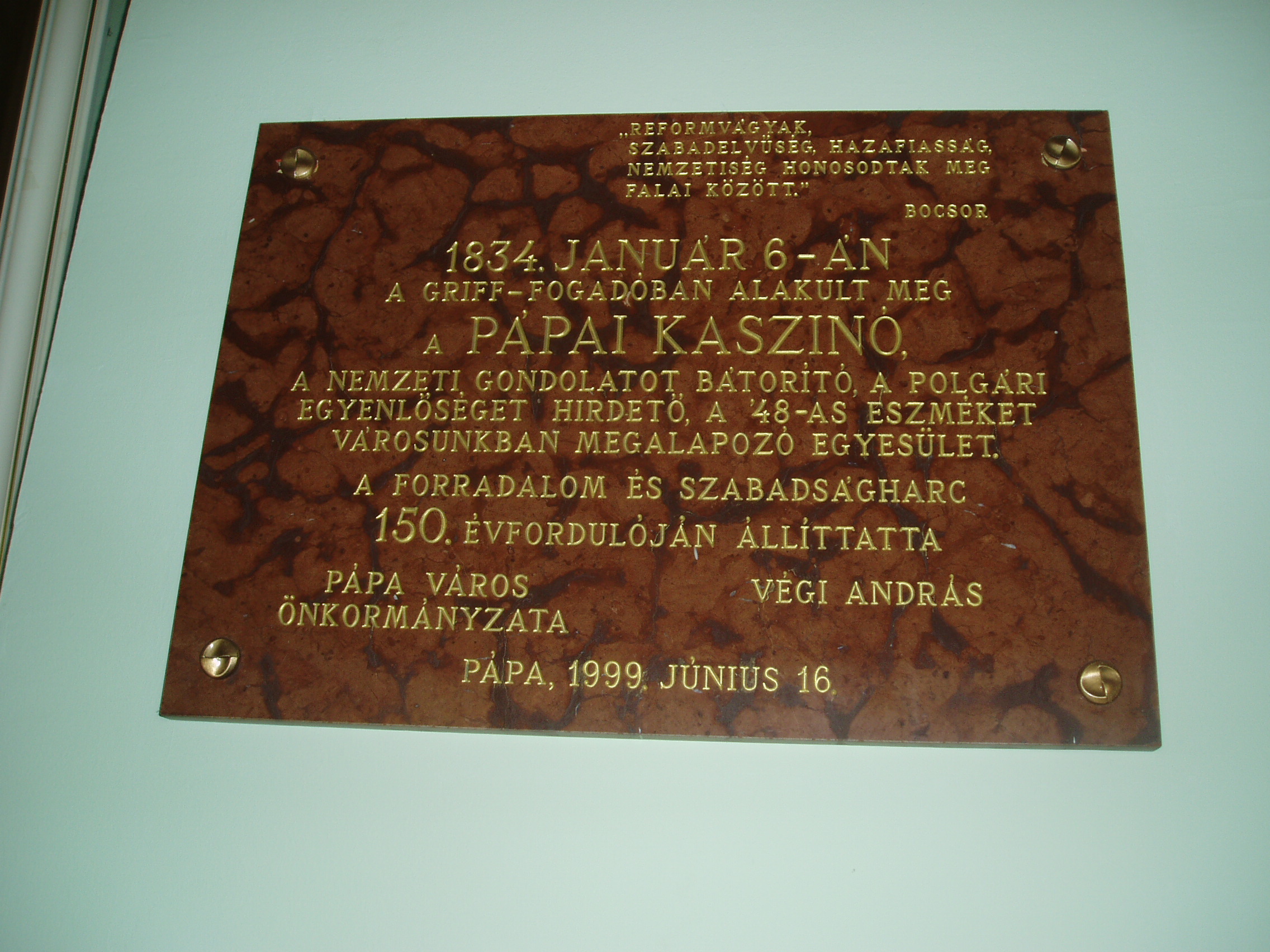 Nyilvános 1179 | 1790 | Pápa, Fő utca 15. Griff Szálló - a Kaszinó megalakulásának emléktáblája | A Fő tér és a Fő utca sarkán áll a Griff Szálló copf stílusú, 1780–1790 között emelt, 1870 körül némileg átalakított épületegyüttese. Nevét az Esterházy család címerállatáról kapta. A Fő utca felőli oldalt Kapuszínnek is nevezik, ugyanis az emelet alatti részen nyílik Pápa sétálóutcájának, a Kossuth utcának a bejárata. A ház másik része a szálloda. A XIX. század folyamán a Griff volt a pápai társas élet központja. Itt alakult meg 1834-ben, Széchenyi István kezdeményezése nyomán — az országban az elsők között — a pápai kaszinó. E jeles eseménynek 1999-ben felavatott vörös márványtábla állít emléket. A Griff ma is meglévő patinás tánctermében — az ún. Tükörteremben — egykor színielőadások és megyebálok zajlottak. Testőrtiszt korában táncolt itt leendő feleségével, Szegedy Rózával Kisfaludy Sándor. Jónéhány évtizeddel később Mikszáth Kálmán volt jelen egy itt tartott táncmulatságon, s ez az élmény inspirálta A Noszty fiú esete Tóth Marival című regényének báli jelenetét. A XIX. század legelejétől 1881-ig, a pápai kőszínház (lásd: Pápa, Március 15. tér) megépítéséig a városba érkező különböző színtársulatok — kevés kivétellel — a Griff nagytermében tartották előadásaikat. A magyar színjátszás nagy egyéniségei közül játszott itt Déryné és Kántorné is. 1842-ben a színielőadások rendszeres látogatója volt két pápai diák, akik maguk is színészi–művészi vágyakat melengettek szívükben: Petőfi Sándor és Jókai Mór (akkor még Petrovics Sándor és Jókay Móric). Petőfi már itt tapsolhatott későbbi jóbarátjának, Egressy Gábornak, aki nevezetes szerepeiben lépett fel a társulat vendégeként — többek között Hamletet és Lear királyt játszotta. A társulat vezető színésznője Szatmáryné Farkas Lujza volt, aki elbűvölte a kamasz Petőfit. Petőfi és Jókai tiszteletüket kívánták tenni a művésznőnél, akit azonban éppen egy társnőjével civakodva találtak a Griff folyosóján. Petőfi — kiábrándulva — ekkor írta meg Szín és való című költeményét, amellyel aztán két arany pályadíjat nyert. A teremben sok jeles hangversenyt is rendeztek. 1937-ben fellépett itt Bartók Béla is fiatal kamarapartnerével, Gertler Endre hegedűművésszel. E nevezetes koncert 60. évfordulóján, 1997-ben emlékhangversenyt rendeztek ugyanitt, melyen részt vett az akkor már 90 esztendős Gertler Endre is. Mindkét eseményről vörös márványtábla emlékezik meg a Tükörteremben. Felh. irod.: Pápa. Szerk. Sz. Farkas Aranka. Bp., Magyar Képek, 2000. Németh Adél – Szabó Lajos: Pápa. Bp. Panoráma, 1989 Nádasdy Lajos: A pápai kőszínház története 1817–1931. Veszprém, 1981, Veszprém megyei Tanács www.kincsestar.radio.hu/harangok "A kényes úrfi s a rongyos baka". Tanulmányok két halhatatlan pápai diákról. Pápa, Pápai Református Gyűjtemények, 2001 |