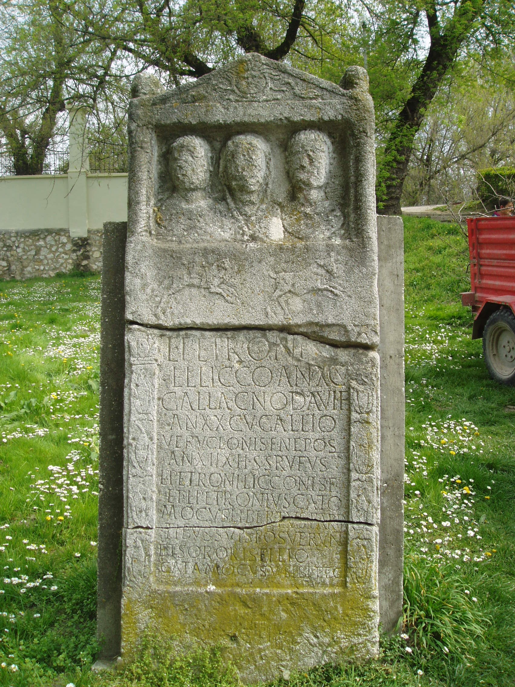 Nyilvános 1202 | 2420 | Pápa, Köztársaság liget 1. | A színház parkjában állították fel a Pápa közelében, Diósdon talált régi római sírkövet. A sírkő egy egykori sírláda fedlapja, mely mészkőből készült. A timpanon díszítésében medúzafő és delfinek láthatók. A három alak ábrája a sírban nyugvó három személyre utal. A sírfelirat szerint a családfő a Petronius nemzetséghez tartozott. Felszabadított rabszolga volt, de jelentős üzleti karriert futott be, s egy kereskedőcég pannóniai képviselője lett. A fénykép 2007 áprilisában készült. Felh. irod.: Jankó László: A kisdiósi Petronius sírkő. = Archaelógiai Értesítő, 1928. 207-210. p. Tóth István: Feliratos római kőemlékek Pápán. = Pápai Múzeumi Értesítő 1995. 160-162. p. Czuppon Elek - Jankó László - Sarudy György: Egy érdekes sírkő Pápán [ ... ]. = Pápai Hírlap, 1927. július 30. - október 15. |