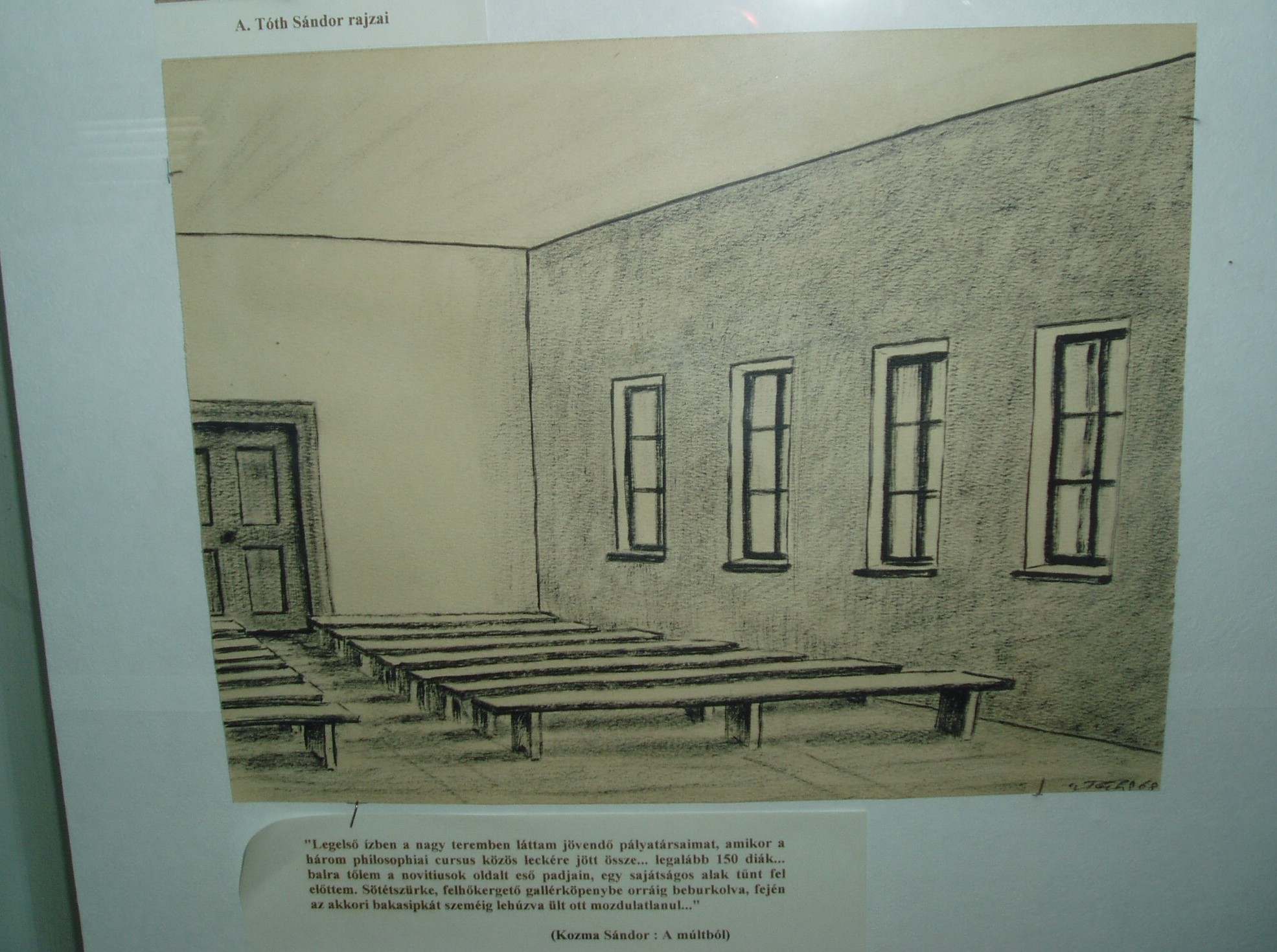 Nyilvános 1172 | 1822 | Pápa, Március 15. tér 9. Pápai Református Kollégium Gimnáziuma | A híres pápai Református Kollégium első épülete 1531 és 1752 között a mai Ruszek közben, a Lábasház épületének helyén állott. 1752-ben - Mária Terézia rendeletének következtében, amely megszüntette a szabad vallásgyakorlást - harminckét évig csak a közeli Adásztevelen működhetett. 1784-ben, II. József türelmi rendeletének köszönhetően térhetett vissza az iskola Pápára, s hamarosan felépült a ma Ókollégiumként ismert épület (lásd: Pápa, Petőfi u. 13.), amelyben 1794-ben indulhatott meg az oktatás. Az intézmény 1857-ig működött ott, ekkor átköltözött a Március 15. tér 13-15. számú házba, az ún. Nátus-ba, majd 1895-ben utolsó végleles helyére, ide, a Március 15. tér 9. számú monumentális új épületbe. Az intézmény könyvtárának előterében kis kiállítás idézi a Kollégium múltját. A képen A. Tóth Sándor rajza látható, amelyen az Ókollégium (lásd: Pápa, Petőfi u. 13.) egy tantermét örökítette meg. A fénykép 2007 áprilisában készült. Felh. irod.: Németh Adél - Szabó Lajos: Pápa. Bp. Panoráma, 1989 http://refi-papa.hu |