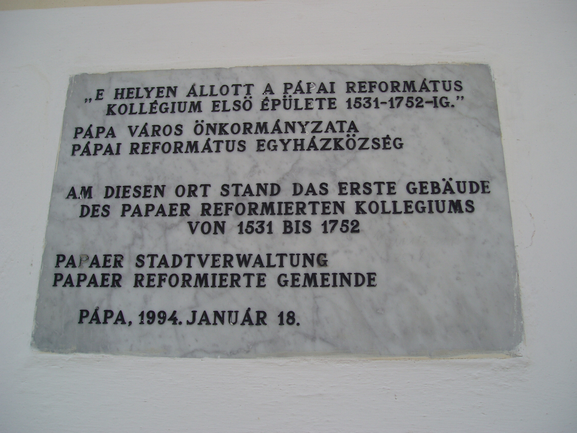 Nyilvános 1151 | 1886 | Pápa, Ruszek köz (a Fő tér felől) | A Fő tér 11. és 12. számú épületek között nyílik a Ruszek köz. A Lábasház (Fő tér 12.) helyén volt a híres református kollégiumnak a közbe benyúló első épülete. Eredetileg katolikus iskola volt, amely 1531-ben alakult át a protestánsok tanintézetévé, majd egy hosszabb fejlődési idő alatt, 1585-ben főiskolábá vált. 1752-ig állt ezen a helyen. Mária Terézia rendeletére ekkor szüntették meg a reformátusok vallásgyakorlatát, s az iskolát a közeli Adásztevelre száműzték, ott működött harminckét évig. 1784-ben térhetett vissza Pápára, s hamarosan felépült új otthona (lásd: Pápa, Petőfi u. 13.). Besétálva a Ruszek közbe, a nagy múltú iskola emléktáblája a bal oldali épületen olvasható. A fénykép 2007 áprilisában készült. Felh. irod.: Németh Adél - Szabó Lajos: Pápa. Bp. Panoráma, 1989 |