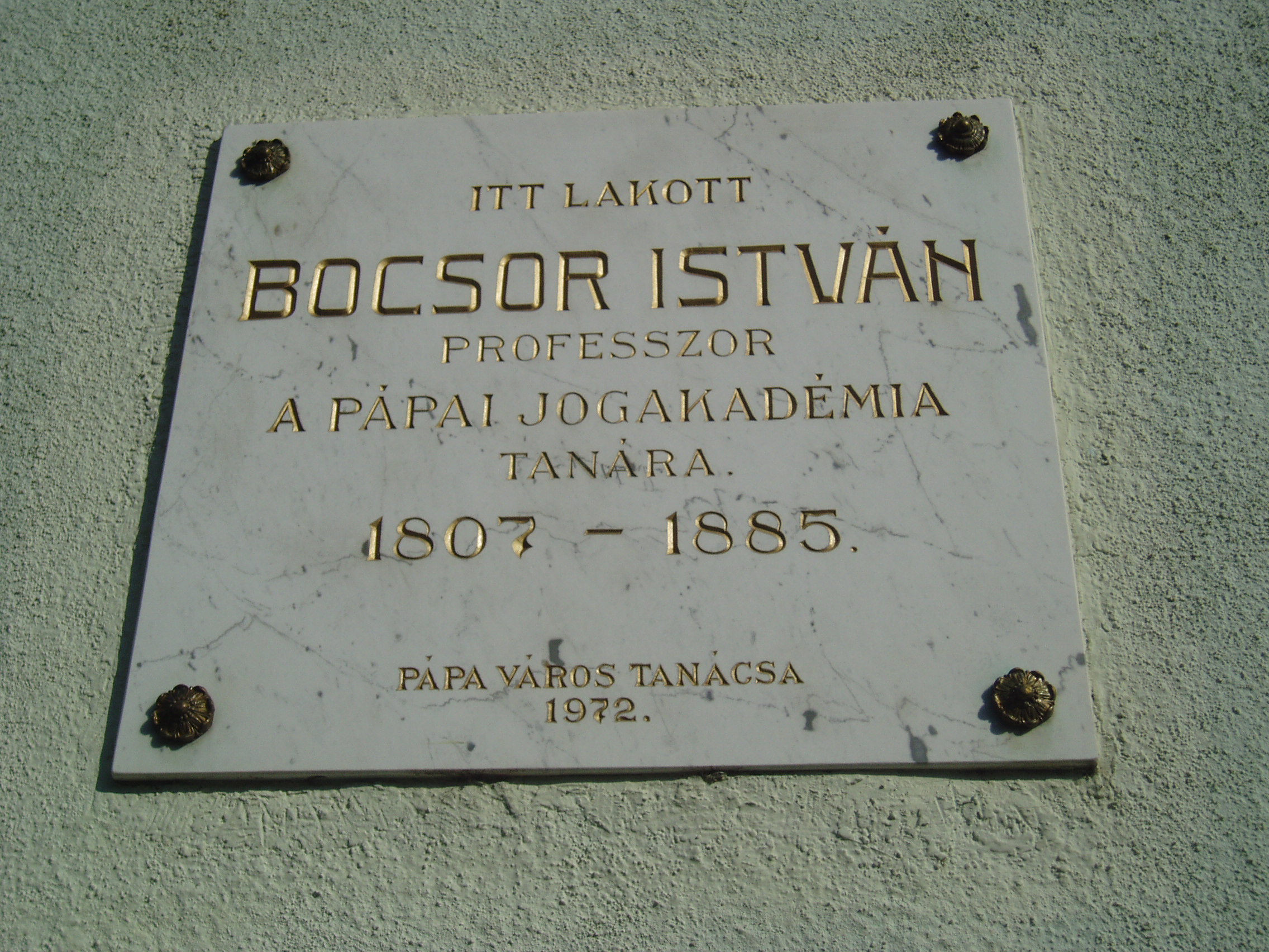 Nyilvános 1248 | 2708 | Pápa, Széchenyi utca 10. | A városi lakóház többszörös kultúrtörténeti jelentőséggel bír. Itt, a ház utcafronti részében lakott Bocsor István (1807-1885), a pápai református kollégium (lásd: Pápa, Petőfi u. 13.) egyik nagy tanáregyénisége. Tanulmányait is abban az iskolában végezte, s 1837-ben lett az intézmény tanára. Magyar nyelvű történelemórái a város közönségére is nagy hatást gyakoroltak. Latin nyelvtana öt kiadást ért meg. 1848-ban az enyingi kerület nemzetgyűlési képviselője volt. A szabadságharc bukása után visszavonultan csak pedagógiai munkásságának élt. Az 1885-ben elhunyt tanár sírja az Alsóvárosi temetőben van (lásd: Pápa, Alsóvárosi temető: Bocsor István sírja). Egykori lakóházán 1972-ben avattak emléktáblát. Alakját a ház másik lakója, a költő Kozma Andor "Karthagói harangok" című versében örökítette meg: A pápai öreg kollégyiom terme Csupa vén diákkal zsúfolásig telve. Ajkuk néma, mint a faragott képnek, Pedig verekedő vad fickók lehetnek.: Több homlokon, arcon beforradt sebhelyek, Kemény hideg-vasra valló emlékjelek; Van, kinek hiányzik fél keze, fél lába... Ilyenek is járnak Pápán iskolába. Ki históriában kutat világeszmét, Tudós Bocsor István professzor tart leckét. Tavaly Debrecenben még Enyéng követje, Alig egy fél éve még tömlöcre vetve, Most Bécs kegyelméből, rendőrtől figyelve, Megint katedráján a hatalmas elme. Tilalmas részére a honi történet, Hanem Kárthágórul s Rómárul beszélhet. Im beszél is bőven ékesszavú ajka, Visszatért diákok szomjan csüggnek rajta. ..."S a dicső Kárthágó, mondja a professzor, Végső viadalra keseredett ekkor. Ezer éves multját üti vala arcul, Hogyha lemond gyáván a rátukmált harcrul. maga dölyfös Róma egyedül ha támad, Nem győz hős haragján Kárthágó hadának. Barbár Masszinissza, gaz numíd szövetség, Ez pecsételé meg Kárthágó elestét. Ám Kárthágó népe a bús végveszélyben Nagyszerű halálra buzdult föl kevélyen. A nemzeti zászlók lobogtak kibontva, Tódultak alájuk, nőtt a had naponta, Kárthágói férfit asszony nem marasztott, Hont védeni mentek urak és parasztok, Kereskedőt üzlet, mesterembert szerszám Nem kötött le többé, - beálltak ezerszám. S a zsönge diákok az iskola padját Fegyverért esengve önként odahagyják... Ó, a boldog ifjak, ép erős legények, Mint irigylik őket rokkantlábú vének! S ezek is elmentek, nem sujthatva mással, Sujtani az ellent bátor, bölcs tanáccsal. ... Mily prelekció ez? Úgy zeng, mint az égbolt... Eszmél a professzor, elhallgat, - elég volt. Hogy is volt? - Kárthágó, harangok és ágyú...? Mily anakronizmus, tudatlan és bárgyú! S mégis: a teremben nem mosolyog senki, Csönd van...tüzes arcok...s könnyezik mindenki. Nem szól a professzor; ha még szólna: torkán Kitörne, mely fojtja, a zokogás-orkán. Ül sokáig némán, sóhajt keserveset: "S Kárthágó - elesett." A fénykép 2007 áprilisában készült. Felh. irod.: "A kényes úrfi s a rongyos baka". Tanulmányok két halhatatlan pápai diákról. Pápa, 2001, Pápai Református Gyűjtemények |