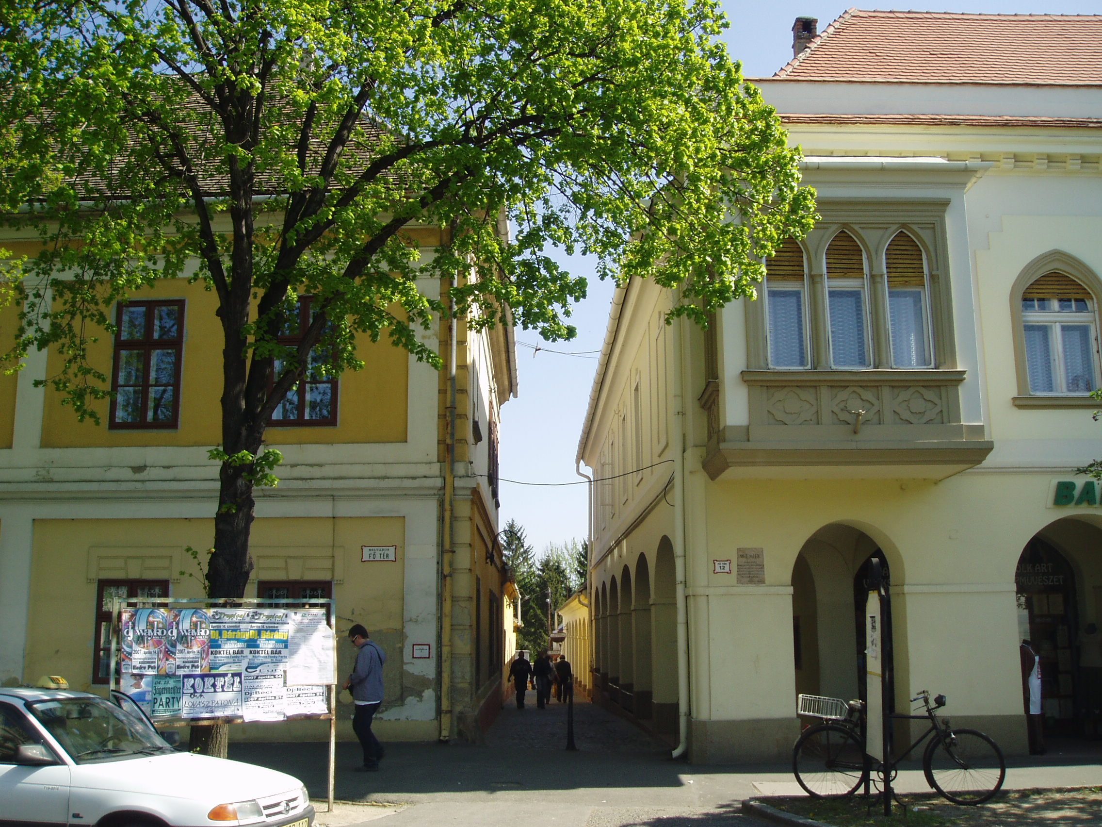 Nyilvános 1105 | 2230 | Pápa, Ruszek köz (a Fő tér felől) | A Fő tér 11. és 12. számú épületek között nyílik a Ruszek köz. A bal oldali, egyemeletes épület (Fő tér 11.) a római katolikus plébániaház. A XVI. századi eredetű épület mai, jellegzetesen barokk megjelenését a XVIII. században nyerte. Jobbra az ún. Lábasház (Fő tér 12.) látható. A XVIII. századi, barokk stílusú épületet a keskeny Ruszek köz felőli oldalon hosszanti és harántívekkel ritmusosan tagolt folyosó tesz egységes megjelenésűvé. Valaha élénk kereskedelmi élet folyt itt. Az épület Fő tér felőli homlokzata a XIX. században neogótikus külsőt kapott. A Lábasház helyén volt a híres református kollégium első épülete. Eredetileg katolikus iskola volt, amely 1531-ben alakult át a protestánsok tanintézetévé, majd egy hosszabb fejlődési idő alatt, 1585-ben főiskolábá vált. 1752-ig állt ezen a helyen. Mária Terézia rendeletére ekkor szüntették meg a reformátusok vallásgyakorlatát, s az iskolát a közeli Adásztevelre száműzték, ott működött harminckét évig. 1784-ben térhetett vissza Pápára, s hamarosan felépült új otthona (lásd: Pápa, Petőfi u. 13.). Besétálva a Ruszek közbe, a nagy múltú iskola emléktáblája a bal oldali épületen olvasható. A fénykép 2007 áprilisában készült. Felh. irod.: Németh Adél - Szabó Lajos: Pápa. Bp. Panoráma, 1989 |