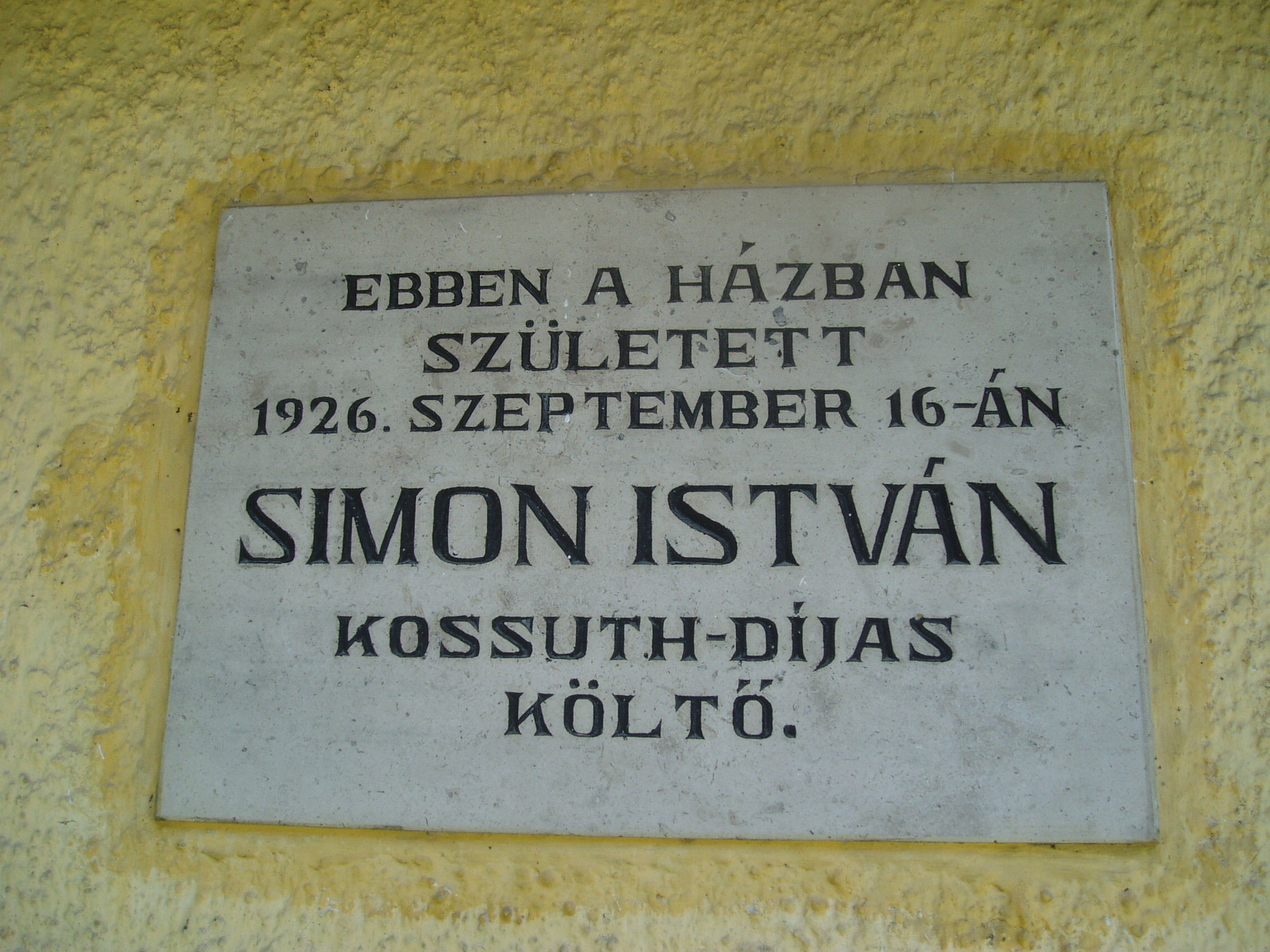 Nyilvános 1398 | 2946 | Rövid leírás | Teljes leírás (1.18 KB) | Bazsi, Fő út 149. 1926. szeptember 16-án itt, az udvari házrészben született Simon István költő. A kis épületet 1983. április 11-én, a költészet napján, országos ünnepség keretében avatták emlékházzá. Benne ma is a költő szüleinek eredeti bútorai és tárgyai láthatók, Simon Istvánról szóló dokumentációval kiegészítve. Simon István tizennyolc éves koráig élt Bazsiban. A sümegi gimnáziumot bejáró diákként végezte el. 1948-tól Budapesten lakott, de gyakran hazajárt szülőfalujába. Számos, ebben a házban készült fényképen látható idős szüleivel a már nagy elismertséget elért költő. 1975 nyarán nagybetegen került a sümegi kórházba, ahol július 6-án elhunyt. Kívánságának megfelelően Bazsiban temették el (sírjánál sajnos nem jártam, a temető elég messze van a falutól - K.K.). A szegényparaszti környezet, a szülőföld, a Sümeg környéki táj mindvégig éltető eleme volt költészetének. A fénykép 2007 júniusában készült. Felh. irod.: Erős Zoltán: Magyar irodalmi helynevek A-tól Z-ig. Bp. Kis-Lant Kiadó, 1995 |
