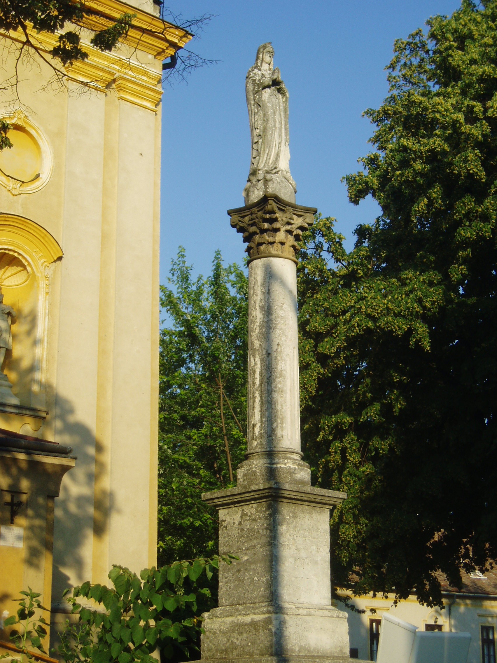 Nyilvános 1136 | 1683 | Sümeg, Bíró Márton utca 1. Plébániatemplom | Sümeg egyik legszebb épülete az Urunk mennybemenetele tiszteletére emelt római katolikus templom. Ezen a helyen már a XIV. században templom állott, melyet Padányi Bíró Márton lebontatott, és 1756-1759 között építtette fel a mai barokk plébániatemplomot. Építészetileg a barokk stílus általános, megszokott mintáit mutatja: nyugati főhomlokzatát hatalmas falpillérek díszítik, fölötte háromrészes főpárkány húzódik, a középrészben az építtető püspök címerével. Az épület igazi értékét Franz Anton Maulbertsch falfestményei jelentik, amelyek az egész templombelsőt beborítják. Nem véletlenül nevezik a templomot a rokokó Sixtus-kápolnájának. A templom előtt Schmidt Krisztián 1750 körül készített Szentháromság-oszlopa látható. A fénykép 2007 júniusában készült. Felh. irod.: Koppány Tibor - Kozák Károly: Sümeg útikalauz. Veszprém, Idegenforgalmi Hivatal, 1965 Látnivalók Veszprém megyében. Miskolc, Well-PRess, 2004 Sümegi kalauz. Sümeg, Sümegi Fórum Alapítvány, 1993 |