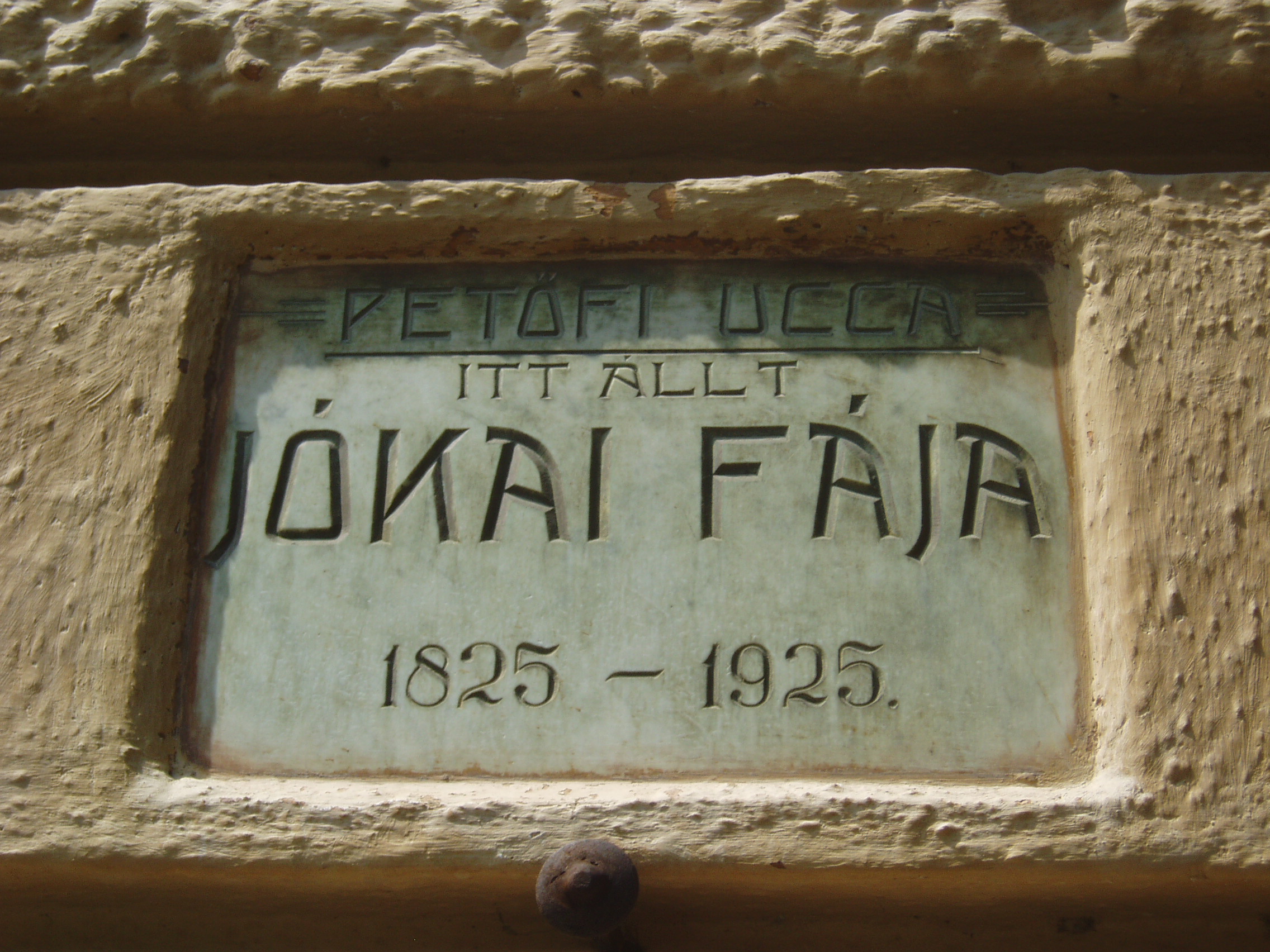 Nyilvános 1134 | 2041 | Sümeg, Kossuth utca 13. | A Kisfaludy szálló épületén a következő rejtélyes emléktábla olvasható: "Petőfi ucca. Itt állt Jókai fája 1825-1925". A források szerint Jókai 1857 nyarán járt Sümegen egy nagyobb kirándulás keretében. Füreden szállt meg, majd Tihanyba és Keszthelyre látogatott. Bejárta és lerajzolta a Balaton-felvidéki várromokat, Sümegen felkereste Kisfaludy Sándor sírját. Minderről be is számol a Magyar hon szépségei című könyvében. De hogy az egykor itt állott fa milyen történetet takar, annak eddig nem jutottam nyomára. A fénykép 2007 júniusában készült. |