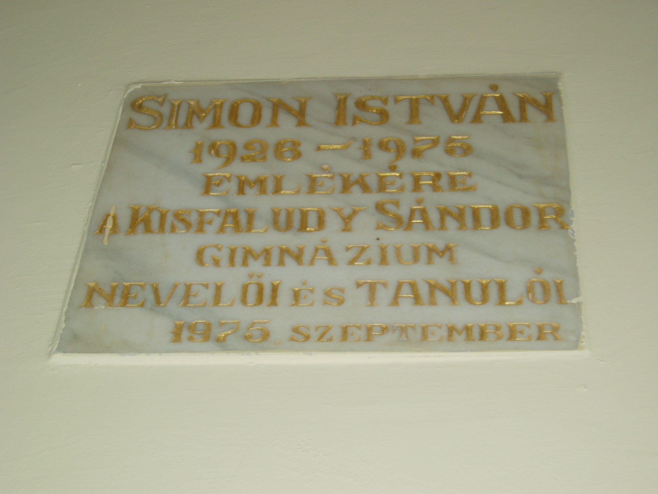 Nyilvános 1113 | 1673 | Sümeg, Mártírok útja 1. Kisfaludy Sándor Gimnázium | A Kossuth Lajos utca és a Mártírok útja sarkán magasodó többszintes épület a sümegi oktatás legimpozánsabb hajléka. Az iskola előcsarnokában több emléktáblát, udvarán pedig Kisfaludy Sándor szobrát helyezték el. A képen a Simon István költő emlékére állított márványtábla látható. A közeli Bazsi községben (lásd: Bazsi, Fő út 149.) született költő ebben az iskolában végezte középiskolai tanulmányait. Ebben az időben jelent meg első verseskötete Egyre magasabban címmel (1944). A fénykép 2007 júniusában készült. Felh. irod.: Koppány Tibor - Kozák Károly: Sümeg útikalauz. Veszprém, Idegenforgalmi Hivatal, 1965 Látnivalók Veszprém megyében. Miskolc, Well-PRess, 2004 Sümegi kalauz. Sümeg, Sümegi Fórum alapítvány, 1993 Veszprém megyei életrajzi lexikon. Veszprém, Veszprém Megyei Önkormányzat Közgyűlése, 1998 |