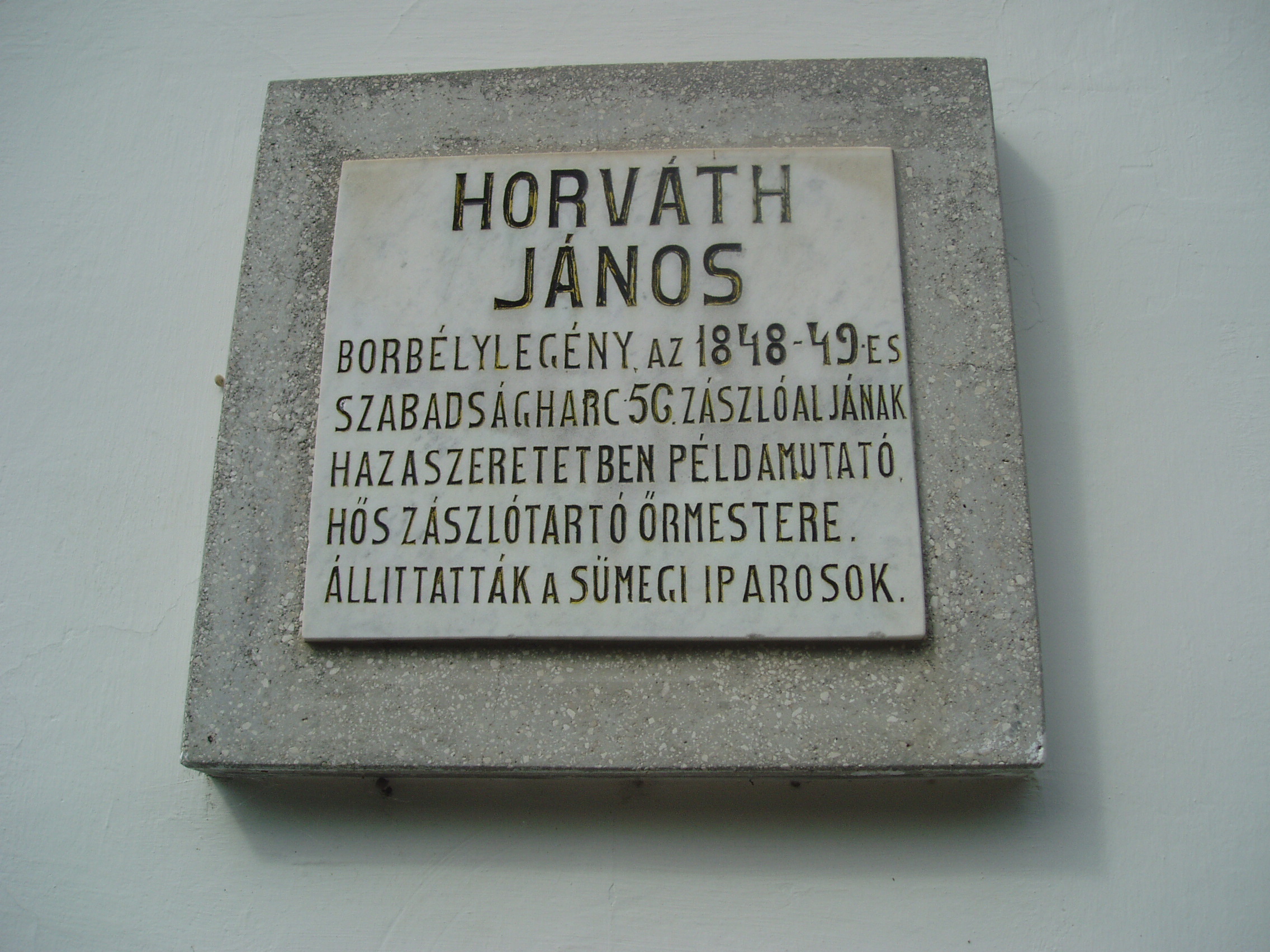 Nyilvános 1120 | 1639 | Sümeg, Panteonfal. Horváth János emléktáblája | A Kisfaludy téren, Kisfaludy Sándor szülőháza előtt alakították ki Sümeg Panteonfalát. A képen Horváth János 1955-ben elhelyezett emléktáblája látható (a Veszprém megyei életrajzi lexikon nem említi). Felirata: HORVÁTH JÁNOS borbélylegény, az 1849-49-es szabadságharc 56. zászlóaljának hazaszeretetben példamutató, hős zászlótartó őrmestere. Állíttatták a sümegi iparosok. A fénykép 2007 júniusában készült. Felh. irod.: Koppány Tibor - Kozák Károly: Sümeg útikalauz. Veszprém, Idegenforgalmi Hivatal, 1965 Látnivalók Veszprém megyében. Miskolc, Well-PRess, 2004 Veszprém megyei életrajzi lexikon. Veszprém, Veszprém Megyei Önkormányzat Közgyűlése, 1998 www.ekmk.hu/emlekhely/Emlekhelyek.html |