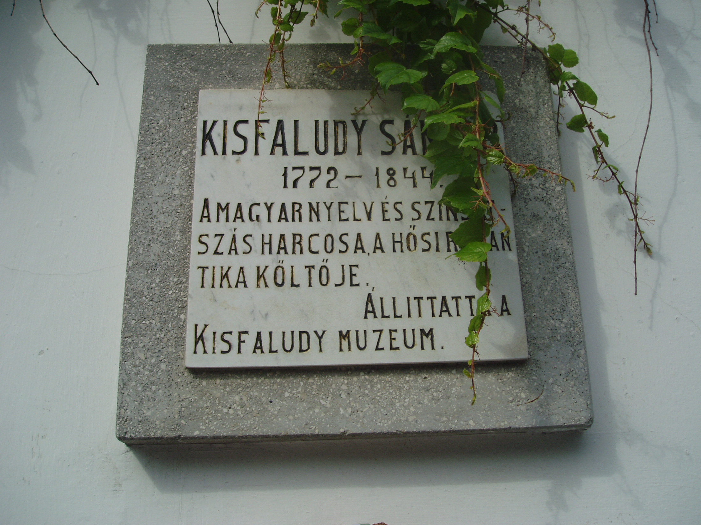 Nyilvános 1104 | 1627 | Sümeg, Panteonfal. Kisfaludy Sándor emléktáblája | A Kisfaludy téren, Kisfaludy Sándor szülőháza előtt alakították ki Sümeg Panteonfalát. A képen Kisfaludy Sándor (1872-1844) emléktáblája látható (1955). Felirata: KISFALUDY SÁNDOR 1772-1844. A magyar nyelv és színjátszás harcosa, a hősi romantika költője. Állíttatta a Kisfaludy Múzeum. Kisfaludy Sándorról bővebben lásd: Sümeg, Kisfaludy tér 2.; Sümeg, Temető. A fénykép 2007 júniusában készült. Felh. irod.: Koppány Tibor - Kozák Károly: Sümeg útikalauz. Veszprém, Idegenforgalmi Hivatal, 1965 Látnivalók Veszprém megyében. Miskolc, Well-PRess, 2004 Veszprém megyei életrajzi lexikon. Veszprém, Veszprém Megyei Önkormányzat Közgyűlése, 1998 www.ekmk.hu/emlekhely/Emlekhelyek.html |