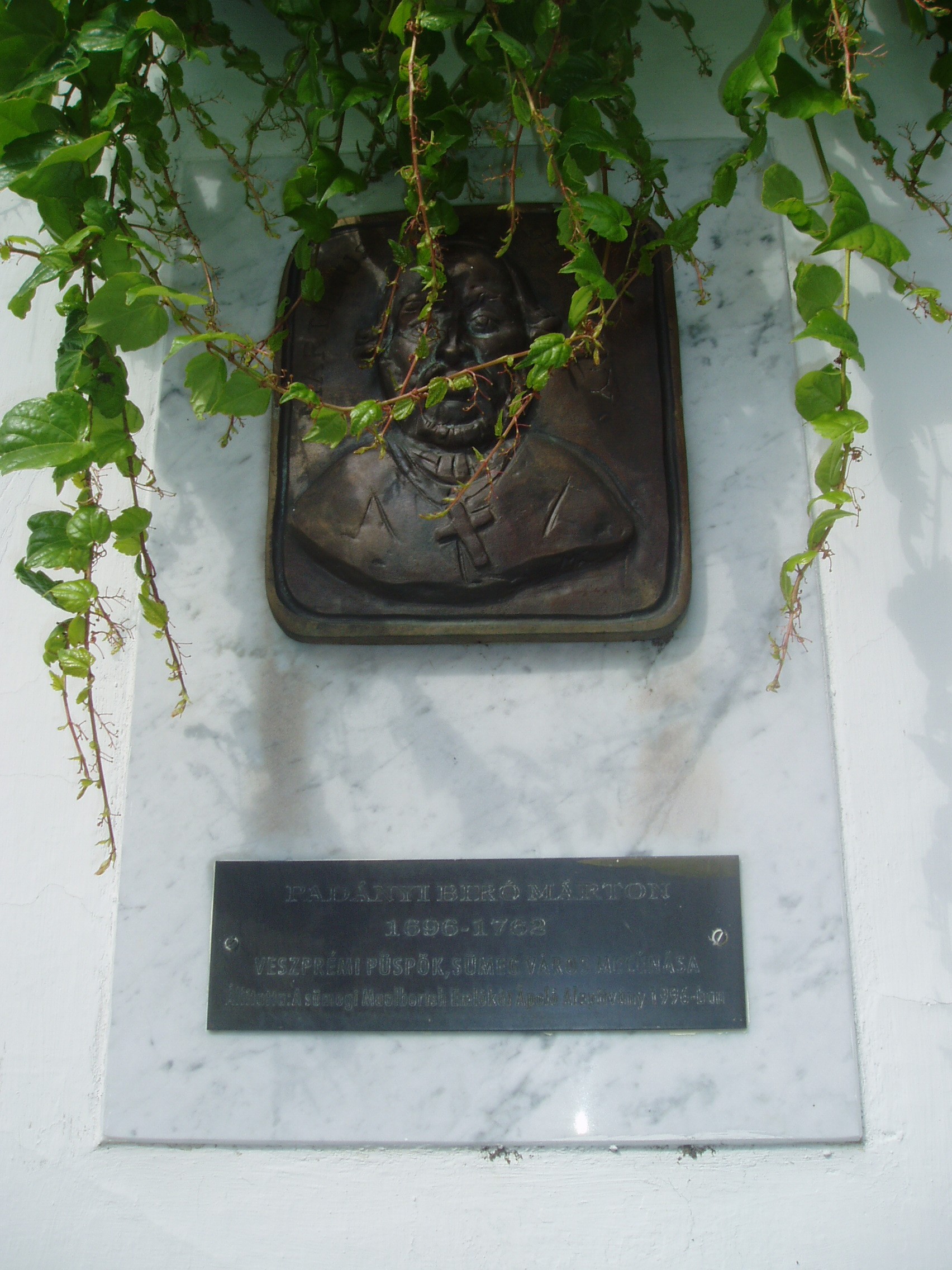 Nyilvános 1134 | 1617 | Sümeg, Panteonfal. Padányi Bíró Márton emléktáblája | A Kisfaludy téren, Kisfaludy Sándor szülőháza előtt alakították ki Sümeg Panteonfalát. A képen Padányi Bíró Márton emléktáblája látható, Máger Ágnes alkotása (1996). Felirata: PADÁNYI BIRÓ MÁRTON, 1696-1762, veszprémi püspök, Sümeg város mecénása Padányi Bíró Márton (Padány, 1696. ápr. 15. – Sümeg, 1762. aug. 10.) író, püspök, főispán. 1729-ben nevezték ki veszprémi kanonokká és felsőörsi préposttá. 1745. márciusától a veszprémi egyházmegye püspöke és a megye főispánja. A káptalannal és a várossal sokat hadakozott, ezért szívesebben tartózkodott Sümegen, ahol megépíttette a ma is álló püspöki palotát (lásd: Sümeg, Szent István tér 10.) és a plébániatemplomot (lásd: Sümeg, Bíró M. u. 1.). Püspöki tevékenységét az egyházmegye látogatásával kezdte, amelynek anyaga 10 hatalmas kötetet tesz ki. Templomok, és iskolák tucatjait építtette vagy állíttatta helyre, amelyeknek jelentős részét a protestánsoktól, nem egy esetben erőszakos, hatalmi eszközökkel szerezte vissza. Az államhatalomnak az eretnekekkel szembeni kötelességeit fejtette ki az Enchiridion de fide c. munkájában, amely 1750-ben jelent meg. A könyv, vallási türelmetlensége miatt nagy vihart kavart, nemzetközi tiltakozásra a királynő elkoboztatta. Nagyvonalúan támogatott írókat műveik kiadásában, művészeket az alkotásban. Maga is sokat írt. Sümegen a plébániatemplom előtt áll bronz mellszobra, Marton László alkotása. A veszprémi székesegyház altemplomában nyugszik. A fénykép 2007 júniusában készült. Felh. irod.: Koppány Tibor - Kozák Károly: Sümeg útikalauz. Veszprém, Idegenforgalmi Hivatal, 1965 Látnivalók Veszprém megyében. Miskolc, Well-PRess, 2004 Veszprém megyei életrajzi lexikon. Veszprém, Veszprém Megyei Önkormányzat Közgyűlése, 1998 www.ekmk.hu/emlekhely/Emlekhelyek.html |