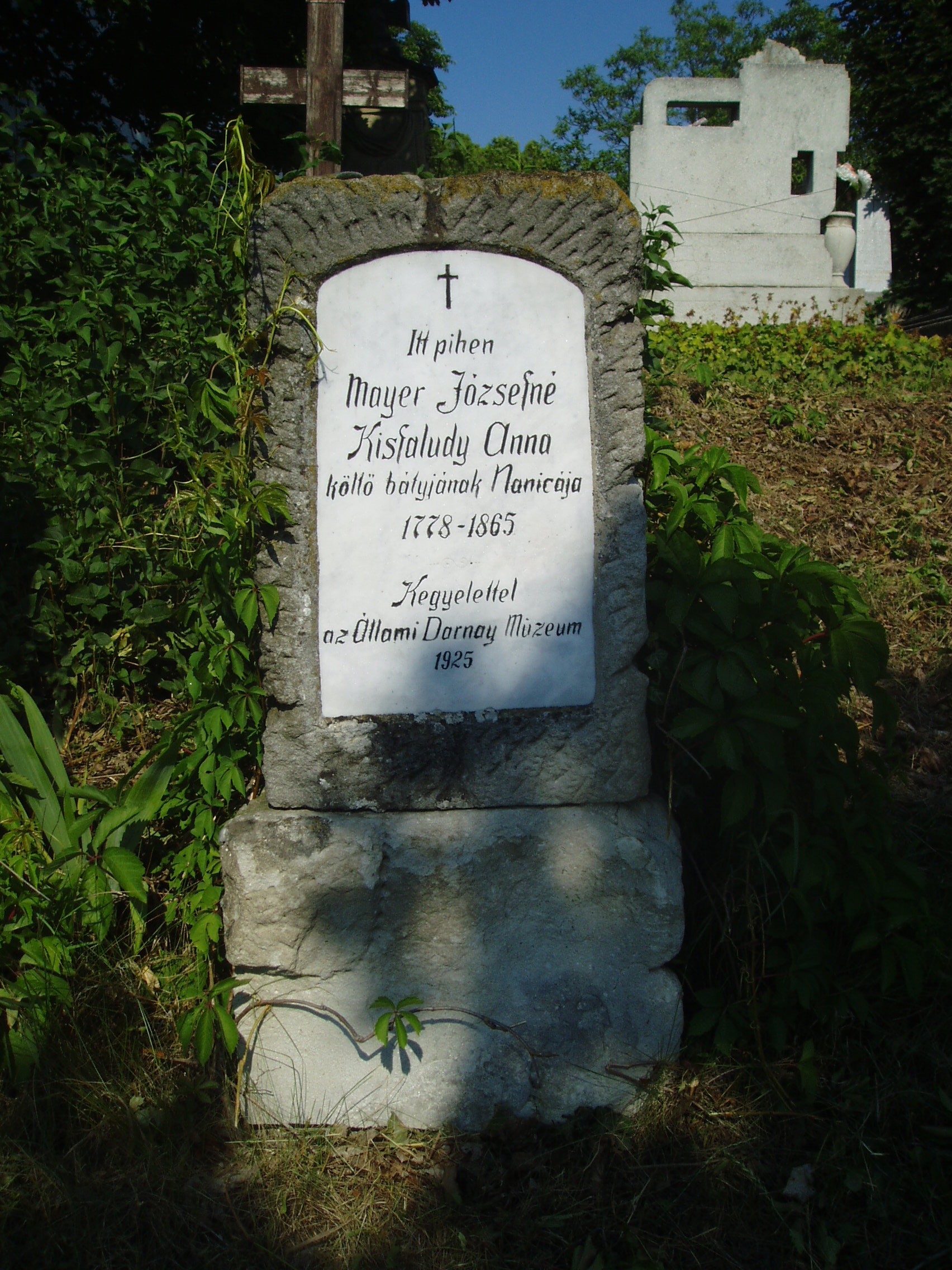Nyilvános 1148 | 2023 | Sümeg, Temető. Kisfaludy Anna sírja | Sümeg délkeleti határában, a Tapolcára vezető út mellett emelkedő lankás domboldalon találjuk a város köztemetőjét. Helyét még Bíró Márton püspök jelölte ki; jelentősebb számban a XIX. század eleje óta kezdtek ide temetkezni. A temetődomb tetején áll az 1816-ban épített, későbarokk stílusú temetőkápolna. Körülötte a sümegi élet utolsó két évszázada szinte valamennyi híres személyiségének sírja fellelhető. Itt nyugszik Kisfaludy Anna (1778-1865), Kisfaludy Sándor Nanicának becézett húga, aki az idős költő legfőbb támasza volt. Férje, az osztrák származású Mayer József (1759-1833), aki részt vett a Napóleon elleni csatákban, amelyeket többkötetes háborús naplóban örökített meg. A kéziratot Darnay Kálmán az Országos Széchenyi Könyvtárnak ajándékozta. Síremléküket 1925-ben az Állami Darnay Múzeum állította. A fénykép 2007 júniusában készült. Felh. irod.: Koppány Tibor - Kozák Károly: Sümeg útikalauz. Veszprém, Idegenforgalmi Hivatal, 1965 Sümegi kalauz. Sümeg, Sümegi Fórum Alapítvány, 1993 Miklósi-Sikes Csaba: Kőbe vésett történelem. A sümegi városi temetők története és sírjelei 1950-ig. Sümeg, Sümegi Fórum Alapítvány, 2002 Veszprém megyei életrajzi lexikon. Veszprém, Veszprém Megyei Önkormányzat Közgyűlése, 1998 |