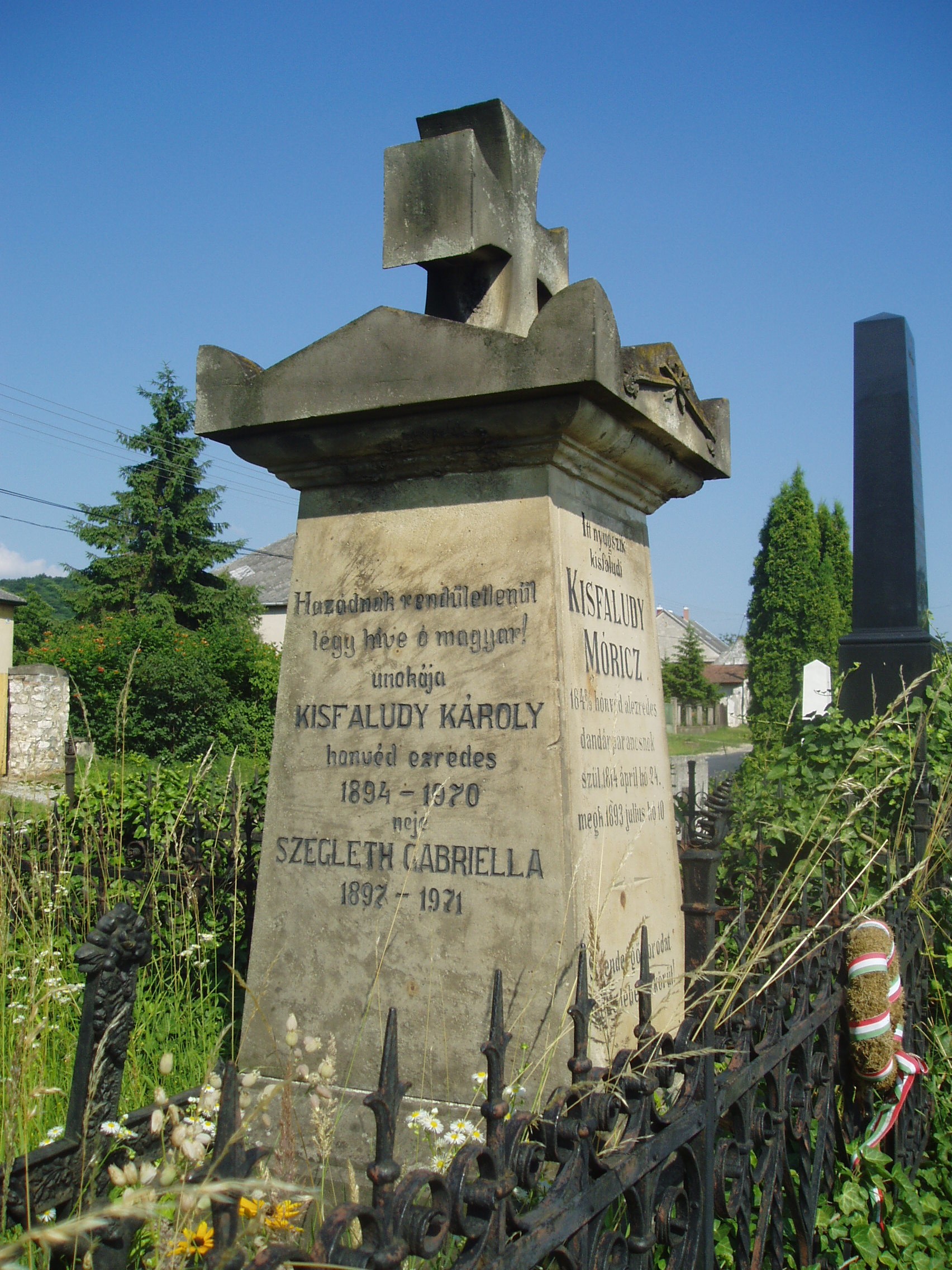 Nyilvános 1124 | 1786 | Sümeg, Temető. Kisfaludy Mór sírja | Sümeg délkeleti határában, a Tapolcára vezető út mellett emelkedő lankás domboldalon találjuk a város köztemetőjét. Helyét még Bíró Márton püspök jelölte ki; jelentősebb számban a XIX. század eleje óta kezdtek ide temetkezni. A temetődomb tetején áll az 1816-ban épített, későbarokk stílusú temetőkápolna. Körülötte a sümegi élet utolsó két évszázada szinte valamennyi híres személyiségének sírja fellelhető. A Tapolcai útra nyíló alsó temetőkapu mellett található Kisfaludy Mór és családja sírkertje. Az empire stílusú sírkő eredetileg Szegedy Róza nyughelyét jelölte. Amikor az 1900-as évek elején egyesítették sírját férjéével, átfaragták sírkövét, s azóta Kisfaludy Mór és családja sírját jelöli. Itt nyugszik Kisfaludy Mór (1814-1893) 1848-as honvéd alezredes, dandárparancsnok, Kisfaludy Sándor unokaöccse. Részt vett az isaszegi, a kápolnai, a pákozdi harcokban, jelen volt Budavár visszafoglalásánál. Aradon halálra ítélték, amit később 16 év várfogságra változtattak. Ismerősei közbenjárására két év múlva kiszabadult, s Sümegre költözött. Véglegesen visszavonult a közélettől, gazdálkodással foglalkozott. Több családtagja is itt van eltemetve. A fénykép 2007 júniusában készült. Felh. irod.: Koppány Tibor - Kozák Károly: Sümeg útikalauz. Veszprém, Idegenforgalmi Hivatal, 1965 Sümegi kalauz. Sümeg, Sümegi Fórum Alapítvány, 1993 Miklósi-Sikes Csaba: Kőbe vésett történelem. A sümegi városi temetők története és sírjelei 1950-ig. Sümeg, Sümegi Fórum Alapítvány, 2002 Veszprém megyei életrajzi lexikon. Veszprém, Veszprém Megyei Önkormányzat Közgyűlése, 1998 |