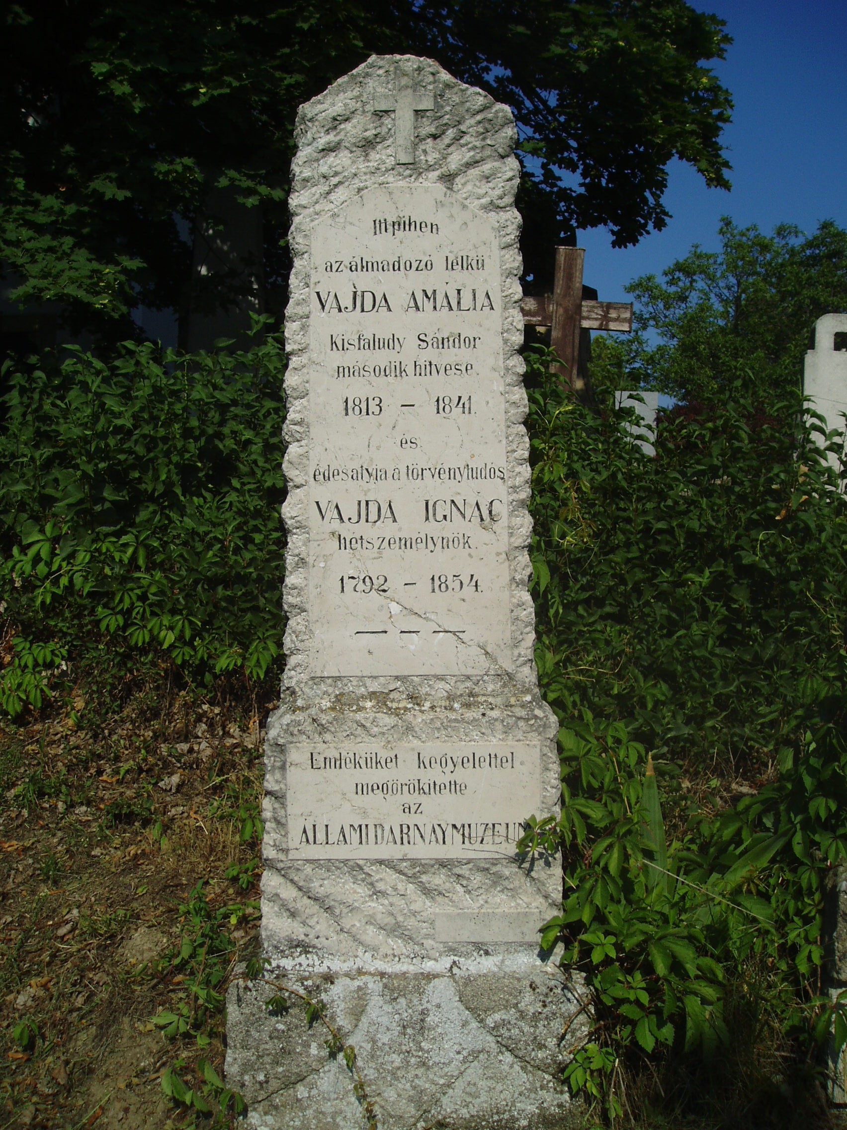 Nyilvános 1146 | 2928 | Sümeg, Temető. Vajda Ignác és Amália sírja | Sümeg délkeleti határában, a Tapolcára vezető út mellett emelkedő lankás domboldalon találjuk a város köztemetőjét. Helyét még Bíró Márton püspök jelölte ki; jelentősebb számban a XIX. század eleje óta kezdtek ide temetkezni. A temetődomb tetején áll az 1816-ban épített, későbarokk stílusú temetőkápolna. Körülötte a sümegi élet utolsó két évszázada szinte valamennyi híres személyiségének sírja fellelhető. A temetőkápolna közelében nyugszik Vajda Ignác (1792-1854) hétszemélynök, több jogi kézikönyv szerzője és fiatalon elhunyt leánya, Vajda Amália (1813-1841), Kisfaludy Sándor költő második felesége 1834-1841 között. A fénykép 2007 júniusában készült. Felh. irod.: Koppány Tibor - Kozák Károly: Sümeg útikalauz. Veszprém, Idegenforgalmi Hivatal, 1965 Sümegi kalauz. Sümeg, Sümegi Fórum Alapítvány, 1993 Miklósi-Sikes Csaba: Kőbe vésett történelem. A sümegi városi temetők története és sírjelei 1950-ig. Sümeg, Sümegi Fórum Alapítvány, 2002 Veszprém megyei életrajzi lexikon. Veszprém, Veszprém Megyei Önkormányzat Közgyűlése, 1998 |