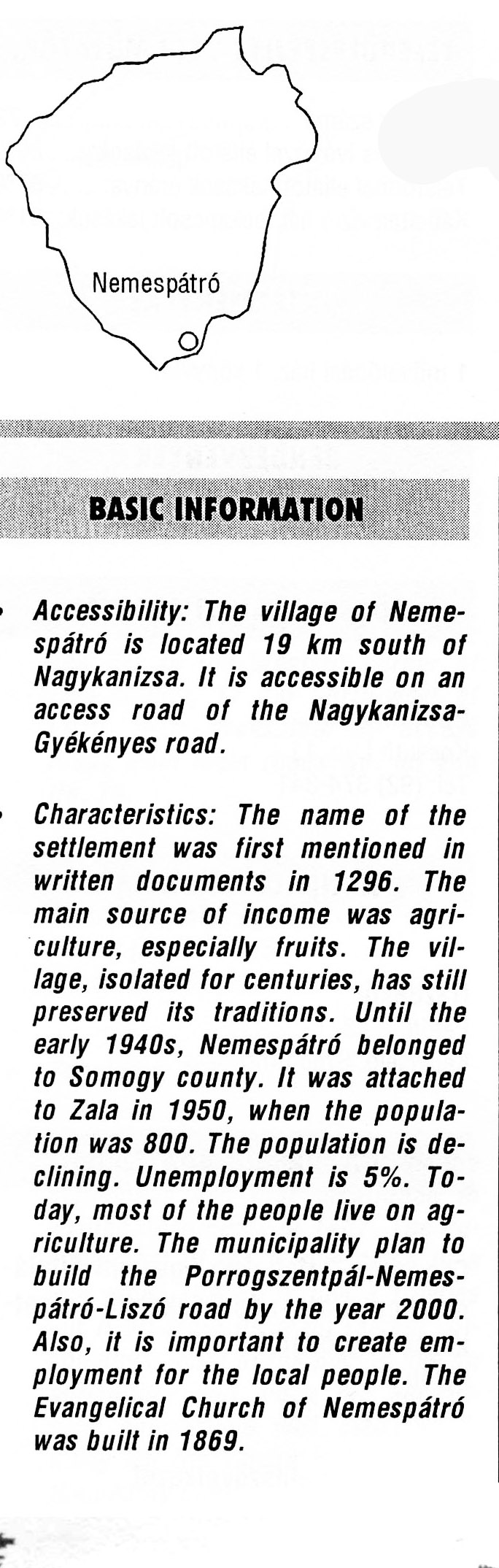 Nyilvános 2204 | 8402 | Nemespátró | BASIC INFORMATION Accessibility: The village of Nemespátró is located 19 km south of Nagykanizsa. It is accessible on an access road of the Nagykanizsa-Gyékényes road. Characteristics: The name of the settlement was first mentioned in written documents in 1296. The main source of income was agriculture, especially fruits. The village, isolated for centuries, has still preserved its traditions. Until the early 1940s, Nemespátró belonged to Somogy county. It was attached to Zala in 1950, when the population was 800. The population is declining. Unemployment is 5%. Today, most of the people live on agriculture. The municipality plan to build the Porrogszentpál-Nemes-pátró-Liszó road by the year 2000. Also, it is important to create employment for the local people. The Evangelical Church of Nemespátró was built in 1869. This text came from the following book: Title: Handbook of Zala county (Zala megye kézikönyve) Series: County handbooks of Hungary (Magyarország megyei kézikönyvei) Chief editor: Hóbor József Publisher: (Hatvan), CEBA-Hungary Ltd, 1998 ETO: 908.439.121(035) ; 050.8(439.121) ISBN: 963-9089-18-2 Pages: 488-1040 p. Remark: Closed on: 1998. márc. 31. |