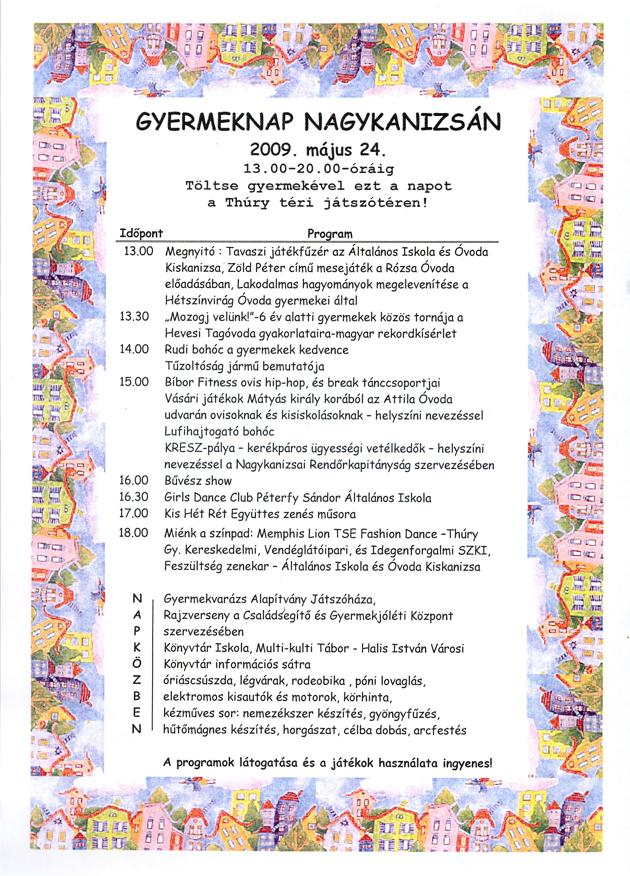 Nyilvános 1822 | 5814 | GYERMEKNAP NAGYKANIZSÁN | 2009. május 24. 13.00-20.00-óráig Töltse gyermekével ezt a napot a Thúry téri játszótéren! Program 13.00 Megnyitó: Tavaszi játékfüzér az Általános Iskola és Óvoda Kiskanizsa, Zöld Péter című mesejáték a Rózsa Óvoda előadásában, Lakodalmas hagyományok megelevenítése a Hétszínvirág Óvoda gyermekei által 13.30 „Mozogj velünk!"- 6 év alatti gyermekek közös tornája a Hevesi Tagóvoda gyakorlataira - magyar rekordkísérlet 14.00 Rudi bohóc a gyermekek kedvence Tűzoltóság jármű bemutatója 15.00 Bíbor Fitness ovis hip-hop, és break tánccsoportjai Vásári játékok Mátyás király korából az Attila Óvoda udvarán ovisoknak és kisiskolásoknak - helyszíni nevezéssel Lufihajtogató bohóc KRESZ-pálya - kerékpáros ügyességi vetélkedők - helyszíni nevezéssel a Nagykanizsai Rendőrkapitányság szervezésében 16.00 Bűvész show 16.30 Girls Dance Club Péterfy Sándor Általános Iskola 17.00 Kis Hét Rét Együttes zenés műsora 18.00 Miénk a színpad: Memphis Lion TSE Fashion Dance - Thúry Gy. Kereskedelmi, Vendéglátóipari, és Idegenforgalmi SZKI, Feszültség zenekar - Altalános Iskola és Óvoda Kiskanizsa Napközben: Gyermekvarázs Alapítvány Játszóháza, Rajzverseny a Családsegítő és Gyermekjóléti Központ szervezésében Könyvtár Iskola, Multi-kulti Tábor - Halis István Városi Könyvtár információs sátra óriáscsúszda, légvárak, rodeobika, pónilovaglás, elektromos kisautók és motorok, körhinta, kézműves sor: nemezékszer készítés, gyöngyfűzés, hűtőmágnes készítés, horgászat, célba dobás, arcfestés A programok látogatása és a játékok használata ingyenes! |