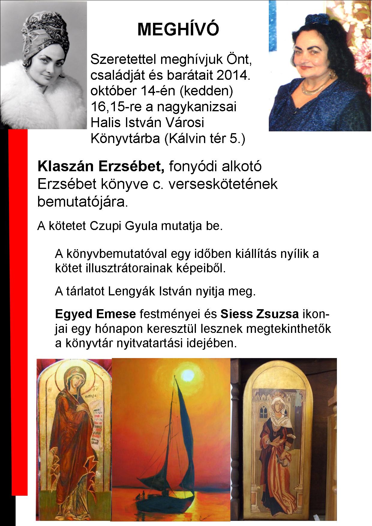 Nyilvános 1240 | 1894 | MEGHÍVÓ | Szeretettel meghívjuk Önt, családját és barátait 2014. október 14-én (kedden) 16,15-re a nagykanizsai Halis István Városi Könyvtárba (Kálvin tér 5.) Klaszán Erzsébet, fonyódi alkotó Erzsébet könyve c. verseskötetének bemutatójára. A kötetet Czupi Gyula mutatja be. A könyvbemutatóval egy időben kiállítás nyílik a kötet illusztrátorainak képeiből. A tárlatot Lengyák István nyitja meg. Egyed Emese festményei és Siess Zsuzsa ikonjai egy hónapon keresztül lesznek megtekinthetők a könyvtár nyitvatartási idejében. |
