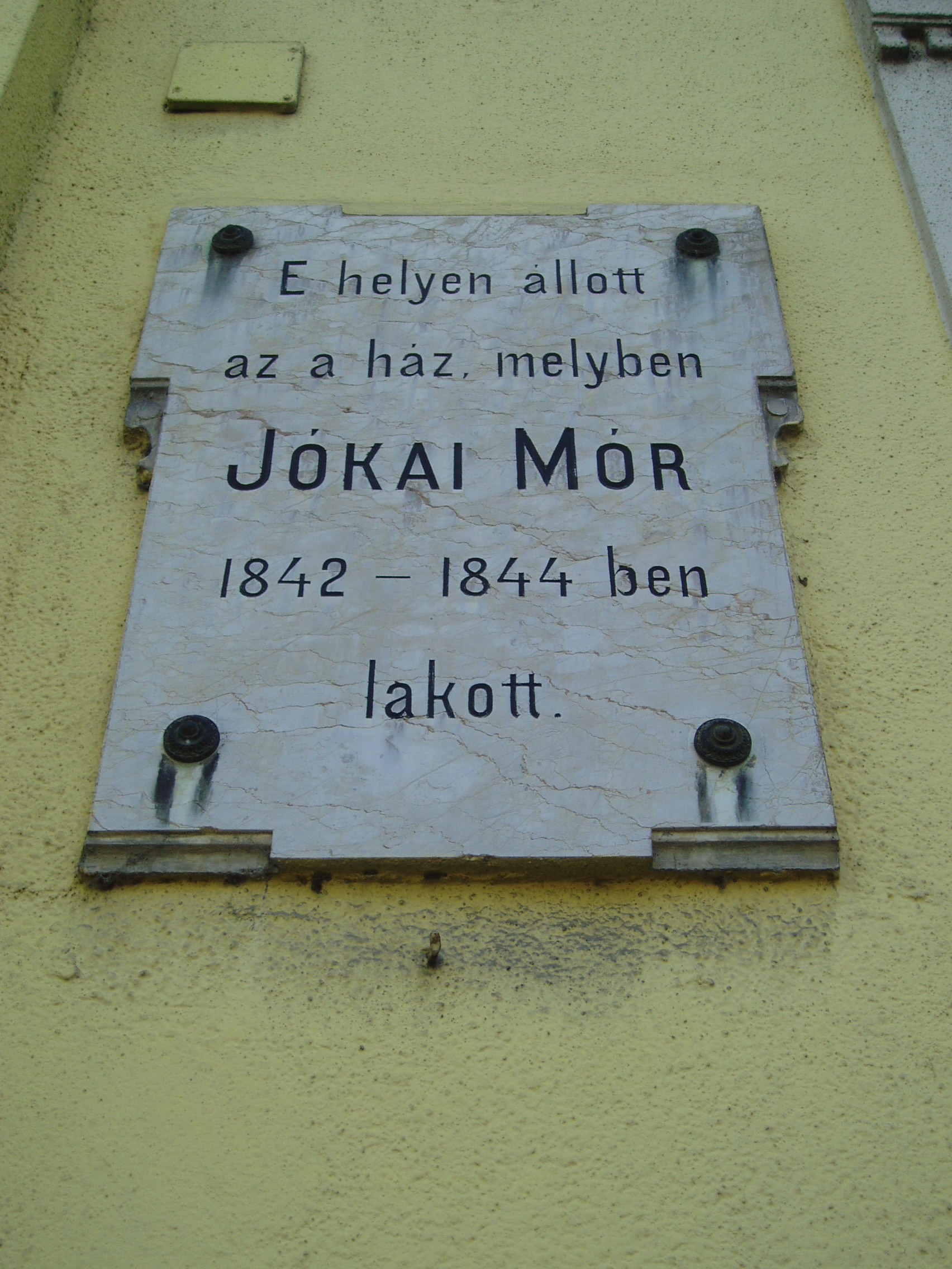 Nyilvános 1265 | 2216 | Kecskemét, Jókai utca 6-8. | Diák korában a korábban ezen a helyen állott épületben, Gyenes Mihályék házában lakott Jókai Mór 1842-44 között. Házigazdája nagy tudású városi mérnök volt, aki az akkor még festőművésznek készülő fiút gyakran magával vitte környékbeli útjaira. Az ekkoriban megismert meg népszokásokat, mint például a pünkösdi király választást vagy a pusztai párbajt később regényeiben is megörökítette. Házigazdájának is köszönhetően írta később: "Itt lett belőlem ember és különösen itt lett belőlem magyar író." Emléktábláját még életében, írói működésének 50. évfordulóján avatták fel. A fénykép 2006 augusztusában készült. Felh. irod.: Heltai Nándor: Kecskemét. Kecskeméti Lapok, 1998 |