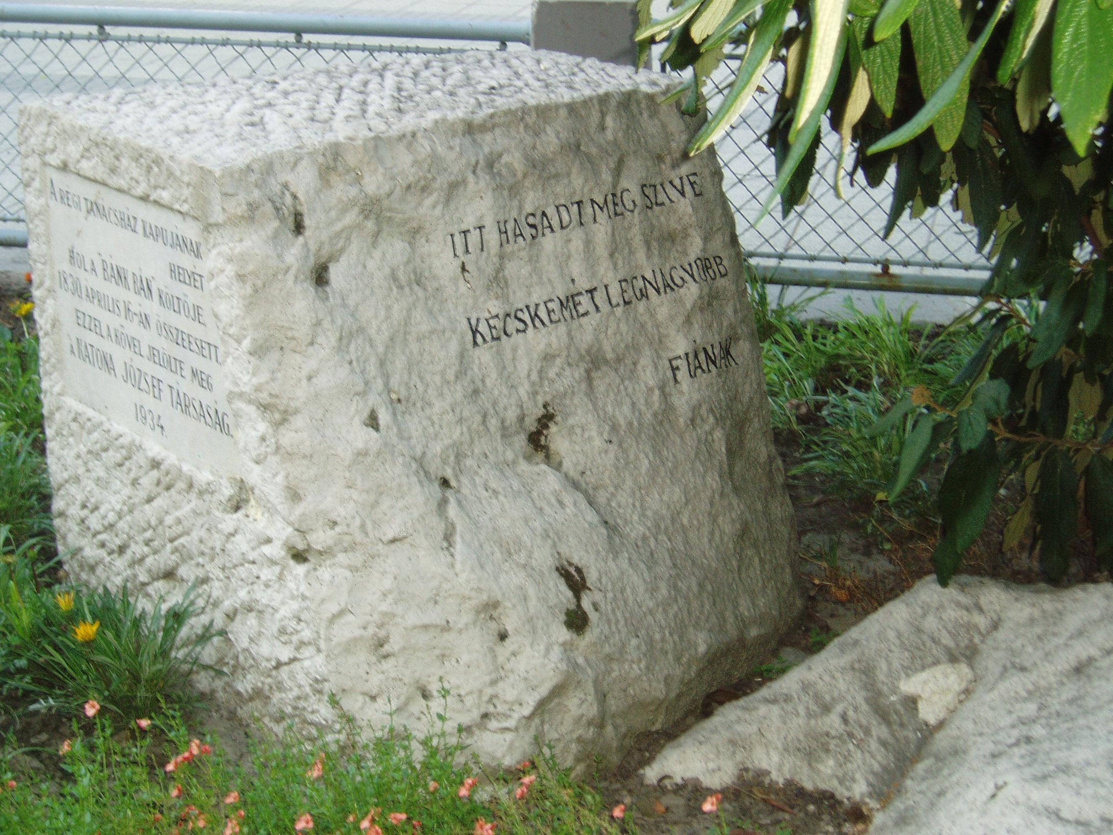 Nyilvános 1166 | 1874 | Kecskemét, Kossuth tér 1. | A szecessziós stílusú városháza 1892-1896 között épült Lechner Ödön és Pártos Gyula tervei szerint. Helyén egykor a régi városháza állott, ott dolgozott Katona József, mint városi ügyész, majd főügyész. Egy zsúfolt délelőtt után, miután megebédelt, egy kollégájával beszélgetve visszafelé tartott hivatalába, amikor a belső folyosón összeesett és szívszélhűdésben elhunyt. Halálának helyén, amely a mai épület előtt található, emlékkövet helyeztek el 1934-ben a következő szöveggel: "Itt hasadt meg a szíve Kecskemét legnagyobb fiának". A fénykép 2006 augusztusában készült. Felh. irod.: Heltai Nándor: Kecskemét. Kecskeméti Lapok, 1998 |