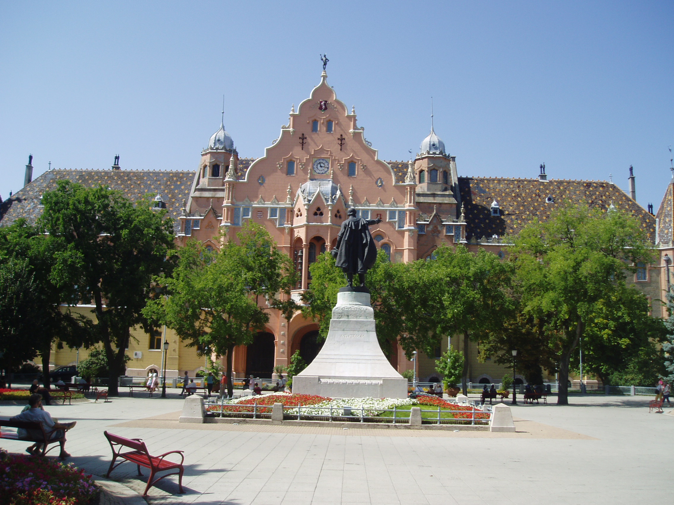 Nyilvános 1196 | 2031 | Kecskemét, Kossuth tér 1. | A szecessziós stílusú városháza 1892-1896 között épült Lechner Ödön és Pártos Gyula tervei szerint. A külső majolikadíszek a Zsolnay-gyárban készültek. Pompázatos közgyűlési termében Székely Bertalan freskói láthatók. A fénykép 2006 augusztusában készült. Felh. irod.: Heltai Nándor: Kecskemét. Kecskeméti Lapok, 1998 |