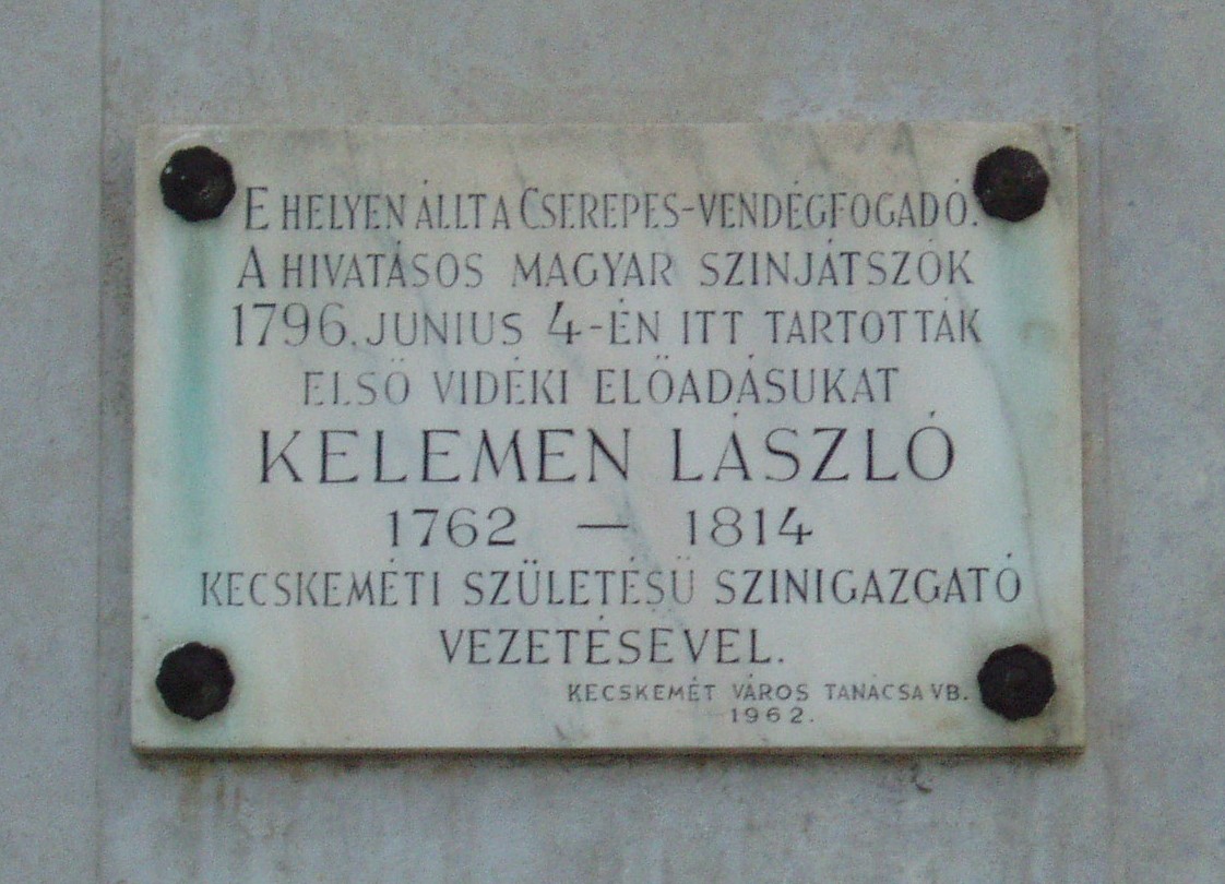 Nyilvános 1234 | 2073 | Kecskemét, Piaristák tere 7. | Az 1950-ben épült kocka alakú, háromszintes SZTK rendelőintézet helyén az 1773–1776 között épített Arany Sas vendégfogadó állott, amelyet a kecskemétiek csak Cserepes néven emlegettek. Udvari fészerében a XVIII. század legvégén alkalmi színpadot alakítottak ki, itt szerepeltek először a városban hivatásos magyar színjátszók, az Első Magyar Játékszíni Társaság. Vezetőjük a kecskeméti születésű Kelemen László volt. Kelemen Lászlóék első kecskeméti előadását Liszka Béla helybeli főreáliskolai tanár keltezte 1796-ra. Újabb vélemények szerint azonban az első hivatásos magyar nyelvű színtársulat csak 1800 nyarán lépett fel Kecskeméten. 1800-ban még Kelemen társulatának tagja volt a szintén kecskeméti születésű és az 1780-as években a piarista gimnáziumban (lásd: Kecskemét, Jókai u. 1.) diákoskodott Szerelemhegyi András, aki színészként és/vagy zenei mindenesként valószínűleg közreműködött a „Cserepes” udvarán megtartott előadásokon. Az Arany Sas fogadóban kecskeméti tanulmányainak megkezdésekor megszállt Jókai Mór, 1857-es országjárása idején pedig Ferenc József és felesége, Erzsébet királyné. Később az épület járásbíróság, majd kórház lett. 1948-ban lebontották s két év múlva emelték helyére a ma is álló épületet. A rendelőintézet Piaristák terére néző falán 1962-ben emléktáblát helyeztek el. A fénykép 2006 augusztusában készült. Felh. irod.: Heltai Nándor: Kecskemét. Kecskeméti Lapok, 1998 Bács-Kiskun megyei történeti és kegyeleti emlékhelyek számbavétele. Kecskemét, 1989. Birck Edit: A Duna–Tisza köze irodalmi országútjain. = Honismeret 2001. 3. |