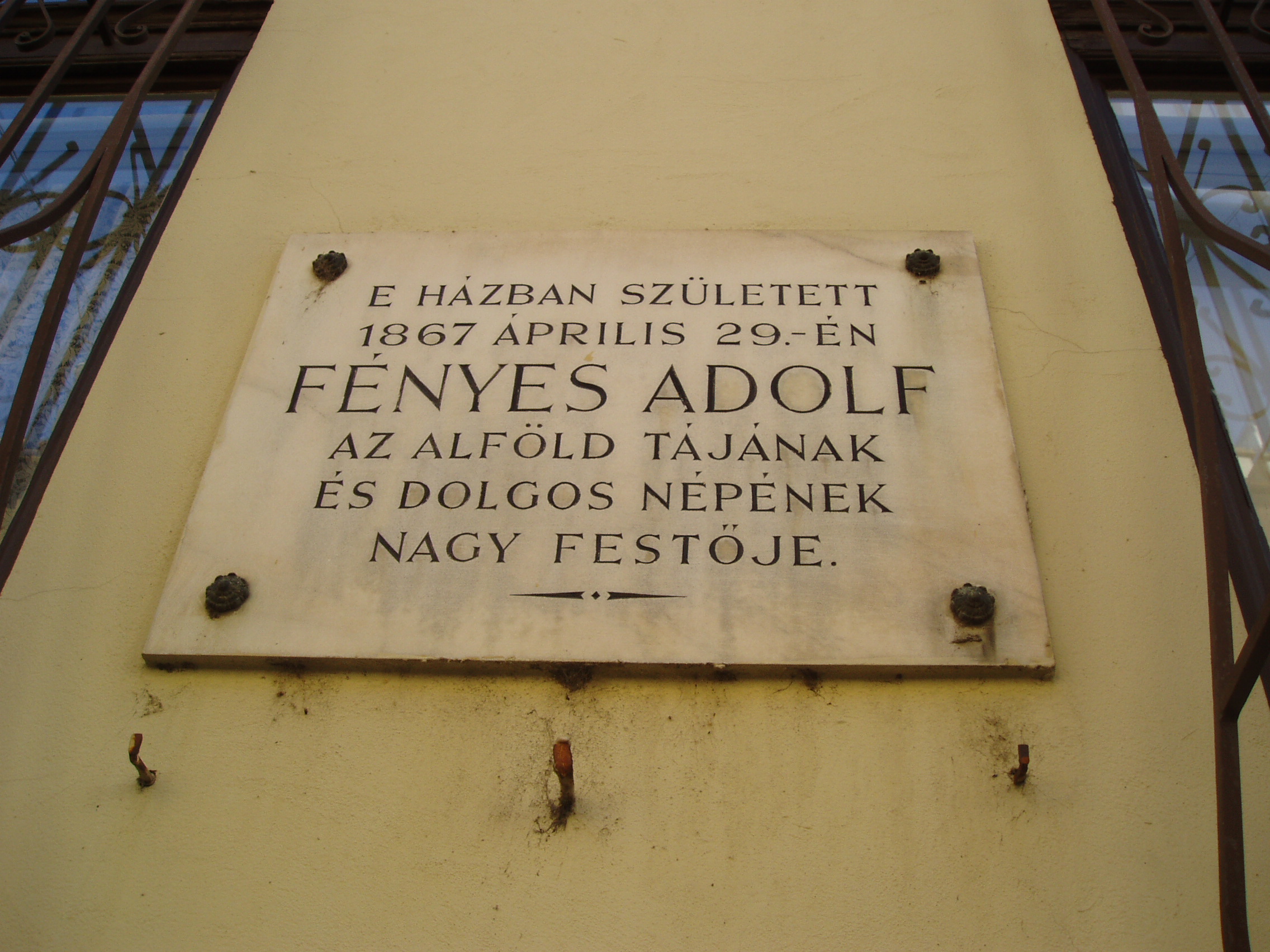 Nyilvános 1240 | 1919 | Kecskemét, Wesselényi utca 6. | Az emeletes városi házon olvasható emléktábla szerint itt született 1867. április 29-én Fényes Adolf. Heltai Nándor, kecskemét történetének kutatója szerint a tábla szövege pontatlan, mert a festőművész nem ebben a házban, hanem a helyén állott korábbi épületben született. Szerinte ez a ház Moór Emánuel zongoraművész és feltaláló szülőháza. Ő viszont Fényes Adolfnál néhány évvel korábban, 1863-ban született, tehát - ha Heltai információja helyes - ő sem ebben a házban, hanem az elődében látta meg a napvilágot. A fénykép 2006 augusztusában készült. Felh. irod.: Heltai Nándor: Kecskemét. Kecskeméti Lapo, 1998 |