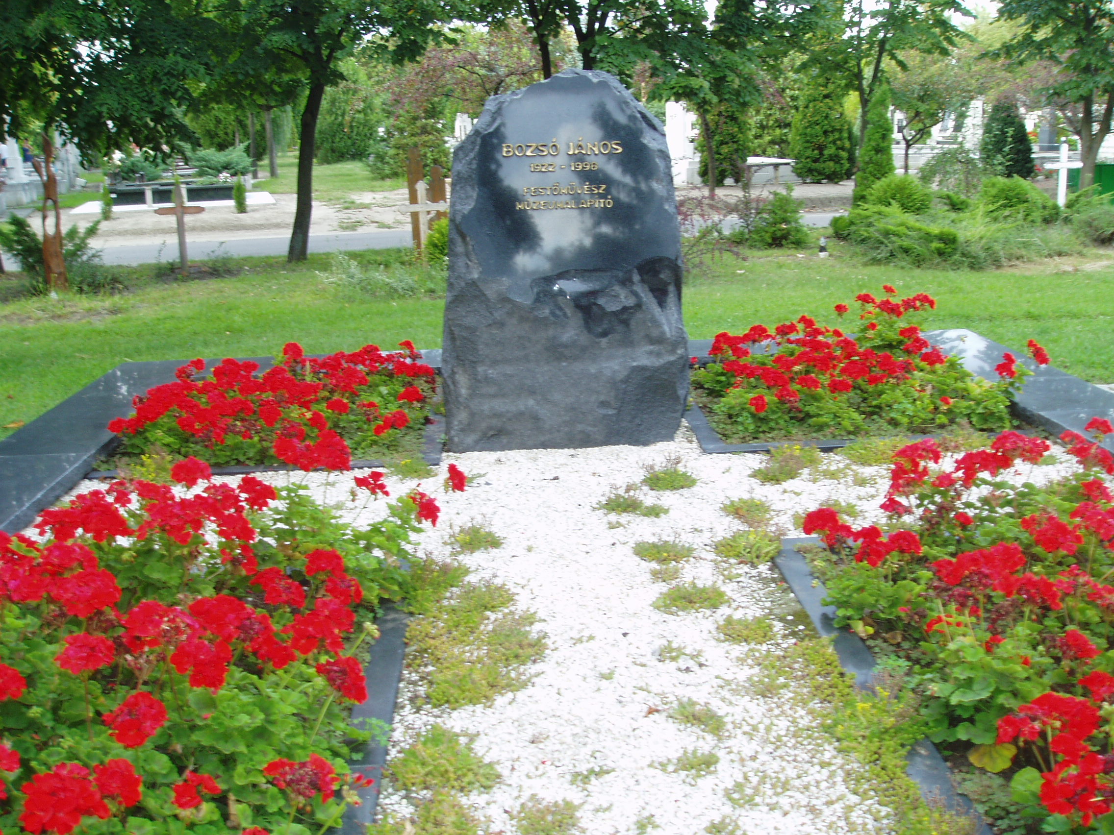 Nyilvános 1246 | 2026 | Kecskemét, Béke fasor 71/A Köztemető: Bozsó János sírja | Az 1960-as években kialakított, nyárfákkal szegélyezett Béke fasor vezet Kecskemét Köztemetőjébe. Már a bejárattól jól látható Katona József hatalmas síremléke, melynek közelében alakították ki a díszsírhelyeket, ahol a város jeles polgárai nyugszanak. Itt van a sírja Bozsó János (1922-1998) festőművésznek is. Az autodidakta festő népművészeti tárgyak gyűjtőjeként fordult az alföldi festészet felé, amelynek elismert művelője lett. Műtárgyaiból magánmúzeumot alapított, amelyet 1976-ban felajánlott Kecskemét városának. A sok ezer darabból álló Bozsó gyűjtemény 1979-ben nyílt meg a nagyközönség előtt, s a festőművész egykori lakóházában látogatható (lásd: Kecskemét, Klapka u. 14.). A fénykép 2006 augusztusában készült. Felh. irod.: Heltai Nándor: Kecskemét. Kecskeméti Lapok, 1998 www.artportal.hu |
