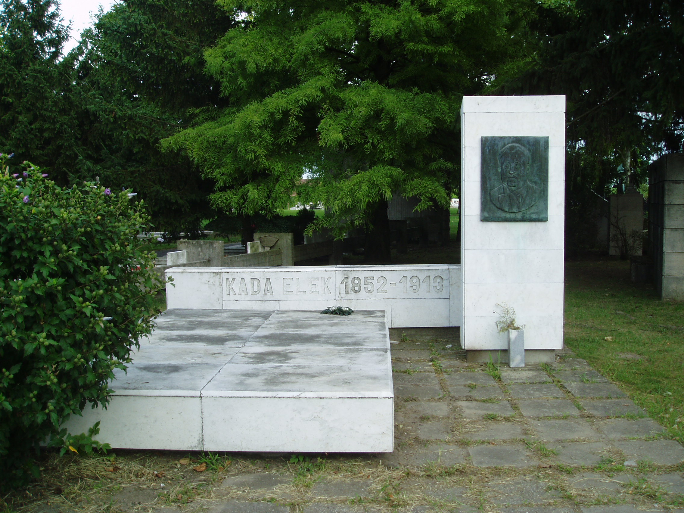 Nyilvános 1186 | 1910 | Kecskemét, Béke fasor 71/A Köztemető: Kada Elek sírja | Az 1960-as években kialakított, nyárfákkal szegélyezett Béke fasor vezet Kecskemét Köztemetőjébe. Már a bejárattól jól látható Katona József hatalmas síremléke, melynek közelében alakították ki a díszsírhelyeket, ahol a város jeles polgárai nyugszanak. Itt nyugszik Kada Elek (1852-1913), Kecskemét történelmének egyik legkiemelkedőbb polgármestere, függetlenségi párti országgyűlési képviselő. 1887-ben választották meg polgármesternek. Hivatali idejében a város addig soha nem látott fejlődésnek indult. Ő kezdeményezte Kecskemét és környékének régészeti feltárását is, s az előkerült leletekből létrehozta a városi múzeumot. Regényeket és színműveket is írt. A fénykép 2006 augusztusában készült. Felh. irod.: Heltai Nándor: Kecskemét. Kecskeméti Lapok, 1998 Székelyné Körösi Ilona: Kecskeméti évszázadok. Fejezetek a város múltjából. Kecskemét, Kecskeméti Lapok, 2003 |