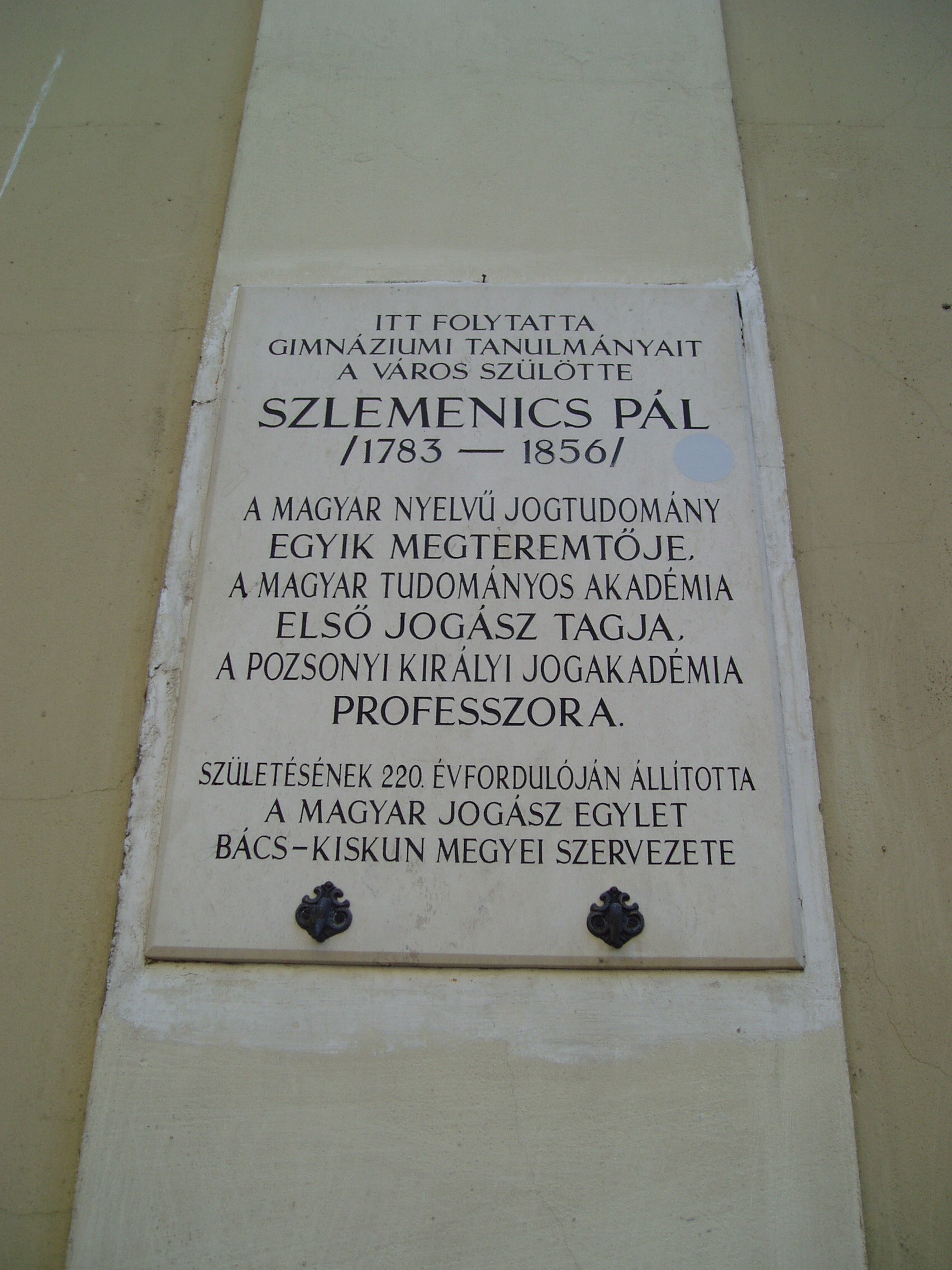 Nyilvános 1209 | 1809 | Kecskemét, Jókai utca 1. Piarista rendház és kollégium | A műemléki védelemmel óvott piarista rendház a mellette álló templommal együtt a város legszebb barokk épületegyüttese. A piarista atyákat a város egyik földesura, gróf Koháry István telepítette le Kecskeméten a XVIII. század elején, s 1712-ben alapítványt is tett templomuk, rendházuk és iskolájuk felépítésére. Az épületegyüttes fokozatosan, több ütemben készült el. A templomot nagy valószínűséggel Mayerhoffer András tervezte. Az oktatást a templom bal oldalán álló, 1720 és 1725 között, Paithmüller József tervei alapján emelt rendház helyiségeiben kezdték el. A jobb oldali iskolai szárnyat 1825–1832 között emelték, majd folyamatosan bővítették az épületet. Tanítás 1933-ig folyt benne. Ide járt iskolába 1804 és 1807 között Katona József, 1813-1815 között Táncsics Mihály, 1833-34-ben Klapka György, később Sík Sándor. Itt tanult az 1780-as években Szerelemhegyi Liebenberger András, a magyar zenés játék megteremtője, karnagy, valamint testvére, Lunkányi (Liebenber) János, Széchenyi István nevelője, műveinek első bírálója. A képen Szlemenics Pál (1783-1856) emléktáblája látható. A magyar nyelvű jogtudomány egyik megteremtője, a Magyar Tudományos Akadémia első jogász tagja, a pozsonyi Királyi Jogakadémia kecskeméti születésű professzora is ide járt gimnáziumba. A fénykép 2006 augusztusában készült. Felh. irod.: Heltai Nándor: Kecskemét. Kecskeméti Lapok, 1998 |