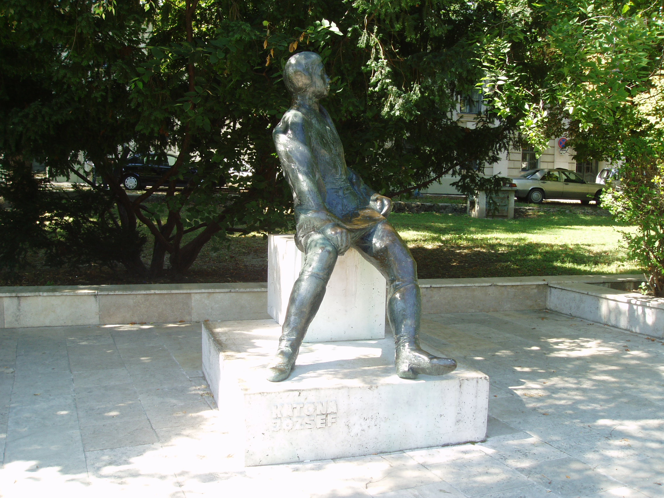 Nyilvános 1124 | 1732 | Kecskemét, Katona József tér 05. Katona József emlékműve | A Katona József Színház mögött 1962. december 16-án Kodály Zoltán avatta fel Vigh Tamás szobrászművész alkotását, Illyés Gyula jelenlétében. Ezen a napon ünnepelte meg szülővárosa Kodály 80. születésnapját, s este a színházban rendezett díszhangversenyen Illyés Gyula maga olvasta fel a Bevezetés egy Kodály-hangversenyhez című versét. A fénykép 2006 augusztusában készült. Felh. irod.: Heltai Nándor: Kecskemét. Kecskeméti Lapok, 1998 Bács-Kiskun megyei történeti és kegyeleti emlékhelyek számbavétele. Kecskemét, 1989 |