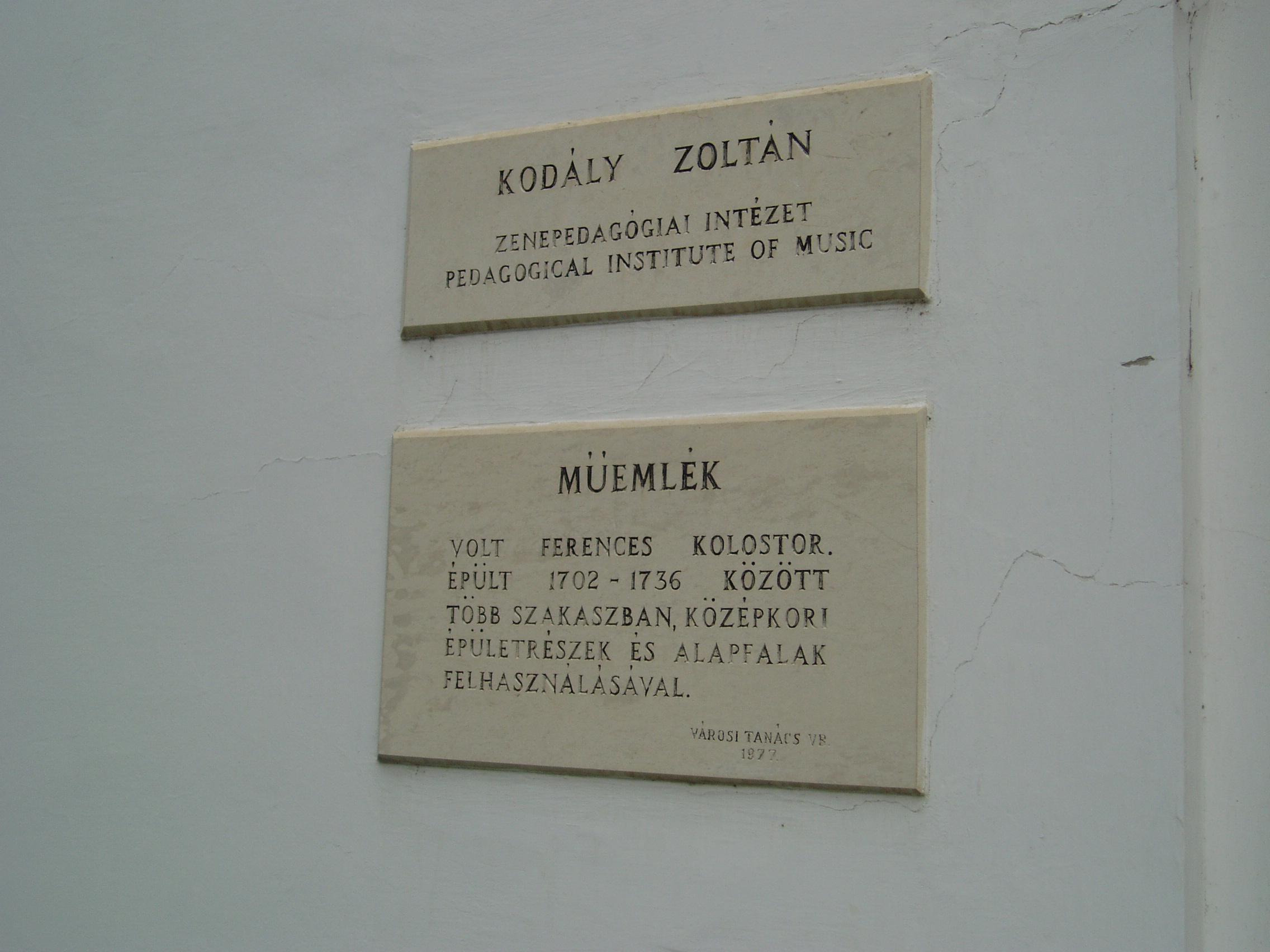 Nyilvános 1125 | 1719 | Kecskemét, Kéttemplomköz 1. Kodály Intézet | A kecskeméti születésű Kodály Zoltán zenepedagógiai törekvéseit és nevelési rendszerét az egész világra kisugárzó Kodály Zoltán Zenepdagógiai Intézet otthona középkori épületrészek és alapfalak felhasználásával ferences kolostornak épült 1702–1736 között. Az épületet Kerényi József tervei szerint 1975-ben alakították át az újonnan alapított Kodály Intézet céljaira. A ragyogó átalakítás az új intézmény igényeit és a műemléki környezet minél teljesebb megóvását egyaránt figyelembe vette. Az 1980-as évek elején — ugyancsak Kerényi József tervei alapján — új szárnnyal bővítették, amely irodáknak, tantermeknek, a zenei szakkönyvtárnak és az audiovizuális stúdiónak ad helyet. Mint az intézmény honlapján is olvasható, a Kodály Intézet a magyar zenepedagógia világszerte ismert és elismert műhelye. Kodály zenei nevelési koncepciójának elméleti és gyakorlati oktatására továbbképzéseket szervez magyar zenetanárok, valamint éves tanfolyamokat külföldi szakemberek számára. A földszinti folyosókon a nagyközönség számára is látogatható állandó Kodály–kiállítást rendeztek, amelyet alkalmankét időszaki tárlatok egészítenek ki. A kolostor egykori refektóriuma ma kiváló akusztikájú hangversenyterem. A kerengő által közrefogott belső udvaron is gyakran rendeznek nyári koncerteket. A fénykép 2006 augusztusában készült. Felh. irod.: Heltai Nándor: Kecskemét. Kecskeméti Lapok, 1998 www.kodály-inst.hu |
