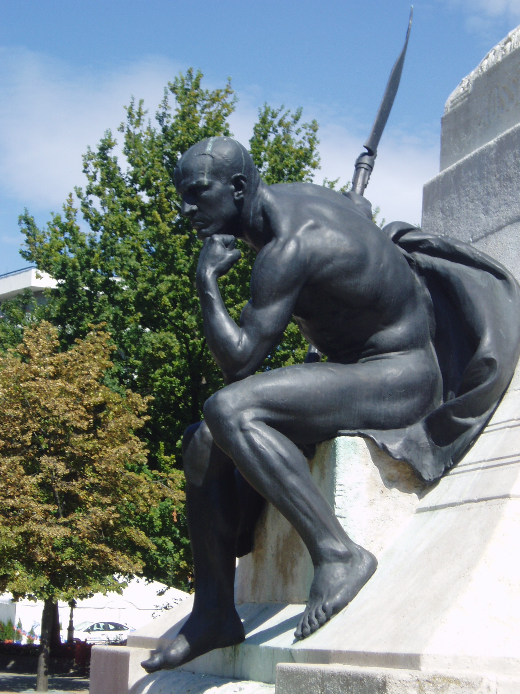 Nyilvános 1168 | 1981 | Kecskemét, Kossuth tér: Kossuth Lajos szobra, mellékalak | Kossuth Lajos 2 és fél méter magas bronzszobrát, Telcs Ede alkotását 1906-ban avatták fel Kecskemét központjában. Az alkotás az 1848/49-es forradalom és szabadságharc emléke mellett Kossuth 1848. szeptember 25-én — ugyanezen a helyen, az akkori régi vásártéren — elmondott toborzó beszédét is felidézi. A szobor ülő mellékalakja kiegyenesített kaszát tart a kezében. E mellékalakról maga a szobrász mondta, hogy ugyan Rodin: Gondolkodó című híres szobrához nagyon hasonló pózban ül, de megfeszített izmokkal, készen rá, hogy ha Kossuth „mégegyszer azt üzeni”, a kezében tartott kiegyenesített kaszával rögtön rámenjen az osztrákra. A helyi hagyomány szerint e mellékalak modellje Kacsóh Pongrác, a János vitéz alapján írt daljáték zeneszerzője volt. A fénykép 2006 augusztusában készült. Felh. irod.: Heltai Nándor: Kecskemét. Kecskeméti Lapok, 1998 Orosz Andrea: Kiskunság és Felső-Bácska. Bp. Frigoria, 2004 |