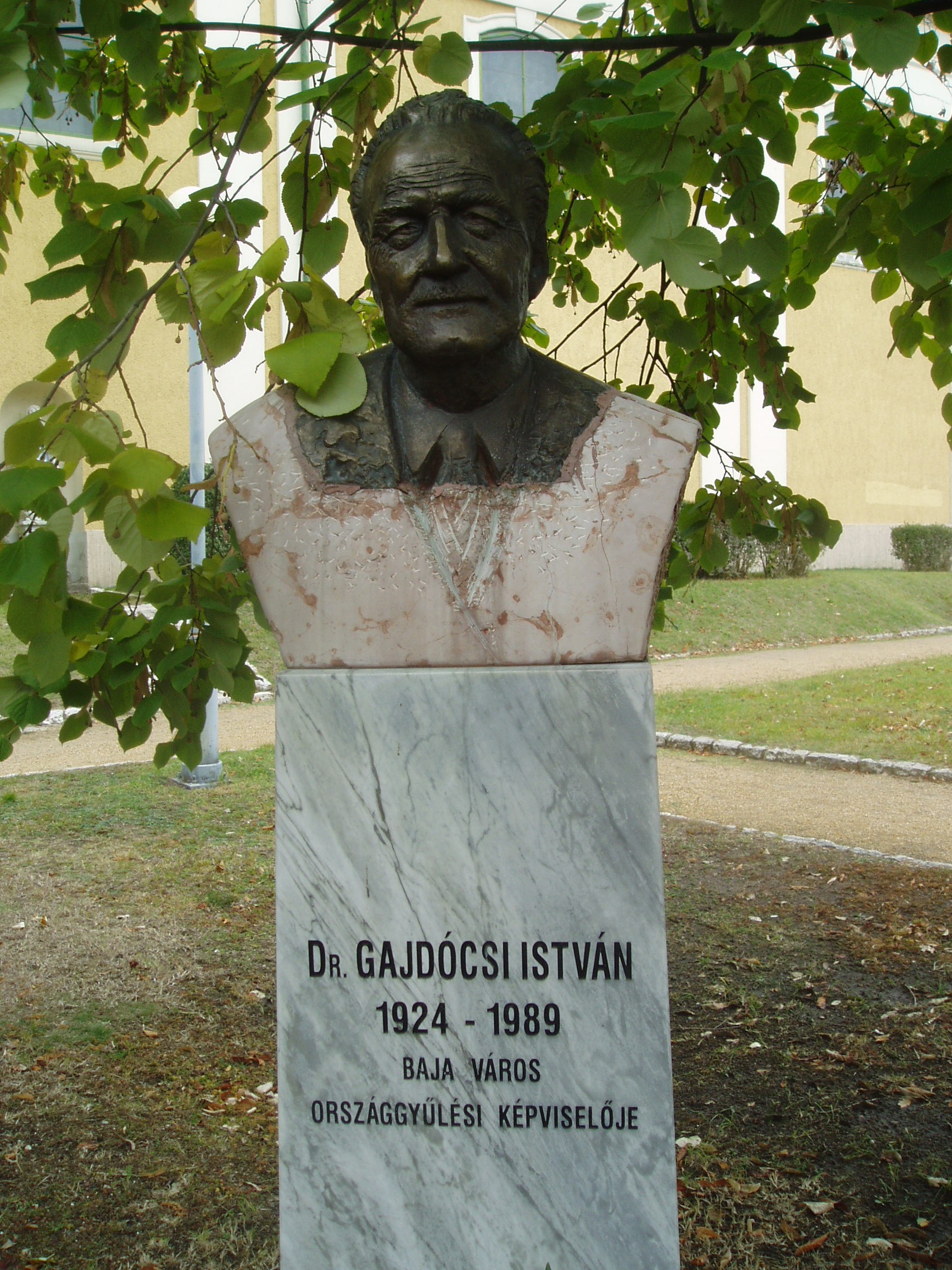 Nyilvános 1466 | 3203 | Baja, Bartók Béla utca 1-3. Páduai Szent Antal ferences kolostortemplom és rendház | Baja központjában áll az egykori ferences rendház, s hozzá tapadva a kolostortemplom, más néven Barátok temploma. A templom déli oldalán levő parkban híres bajai személyiségek mellszobrait állították fel. Itt áll Gajdócsi István mellszobra is, aki a Kádár-korszakban Bács-Kiskun megye tanácselnöke és Baja országgyűlési képviselője volt, s a térség kulturális és művészeti életét jelentősen támogatta. A fénykép 2007 októberében készült. Felh. irod.: Látnivalók Bács-Kiskun megyében. Miskolc, Well-PRess, 2002 www.wikipedia.org |
