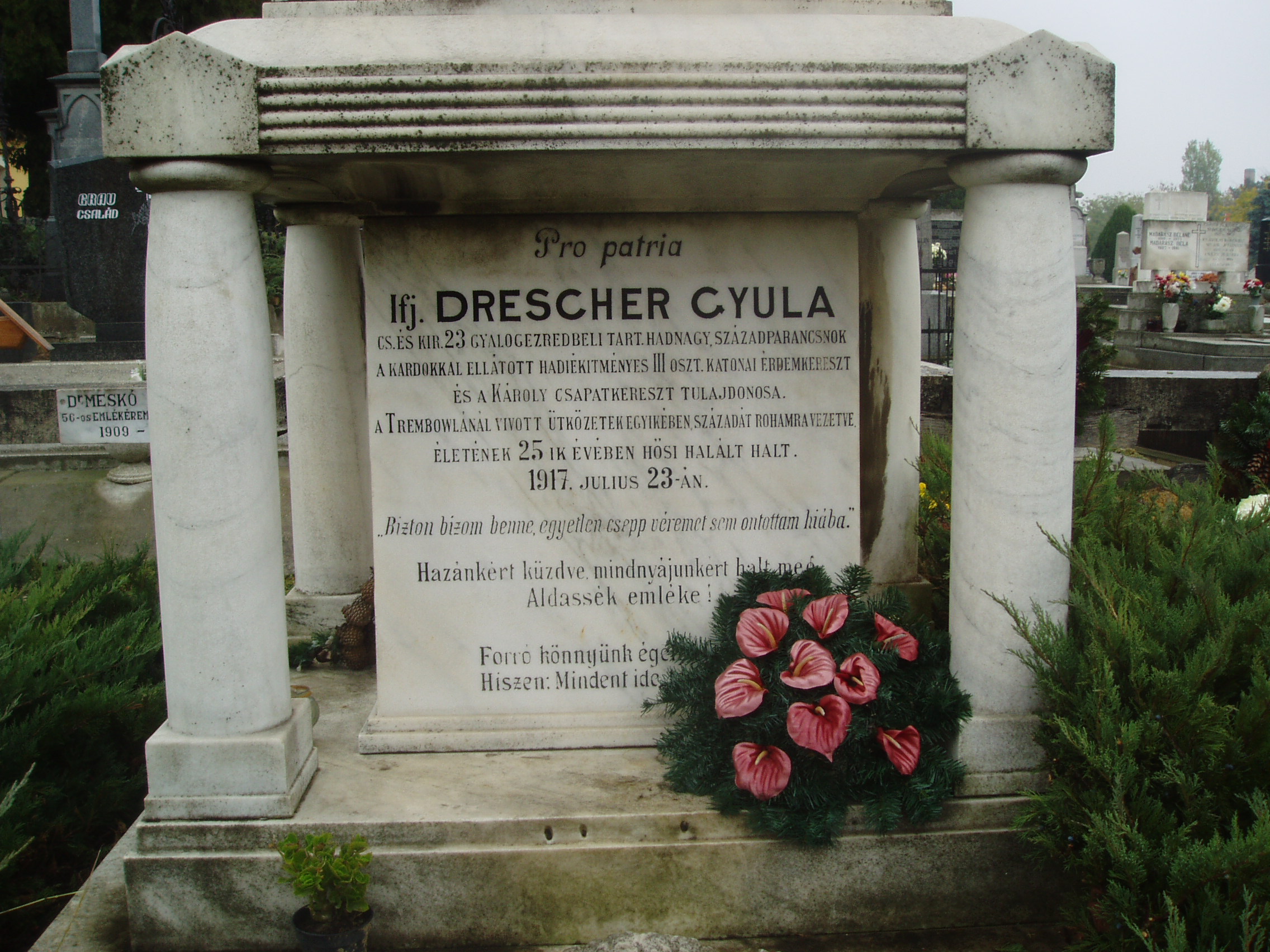 Nyilvános 1146 | 2195 | Baja, Rókus utva: Rókus temető - Drescher Gyula sírja | Itt nyugszik ifj. Drescher Gyula, a 23. gyalogezred tartalékos hadnagya, századparancsnok. Hősi halált halt életének 25. évében, 1917. november 23-án. A fénykép 2007 októberében készült. |