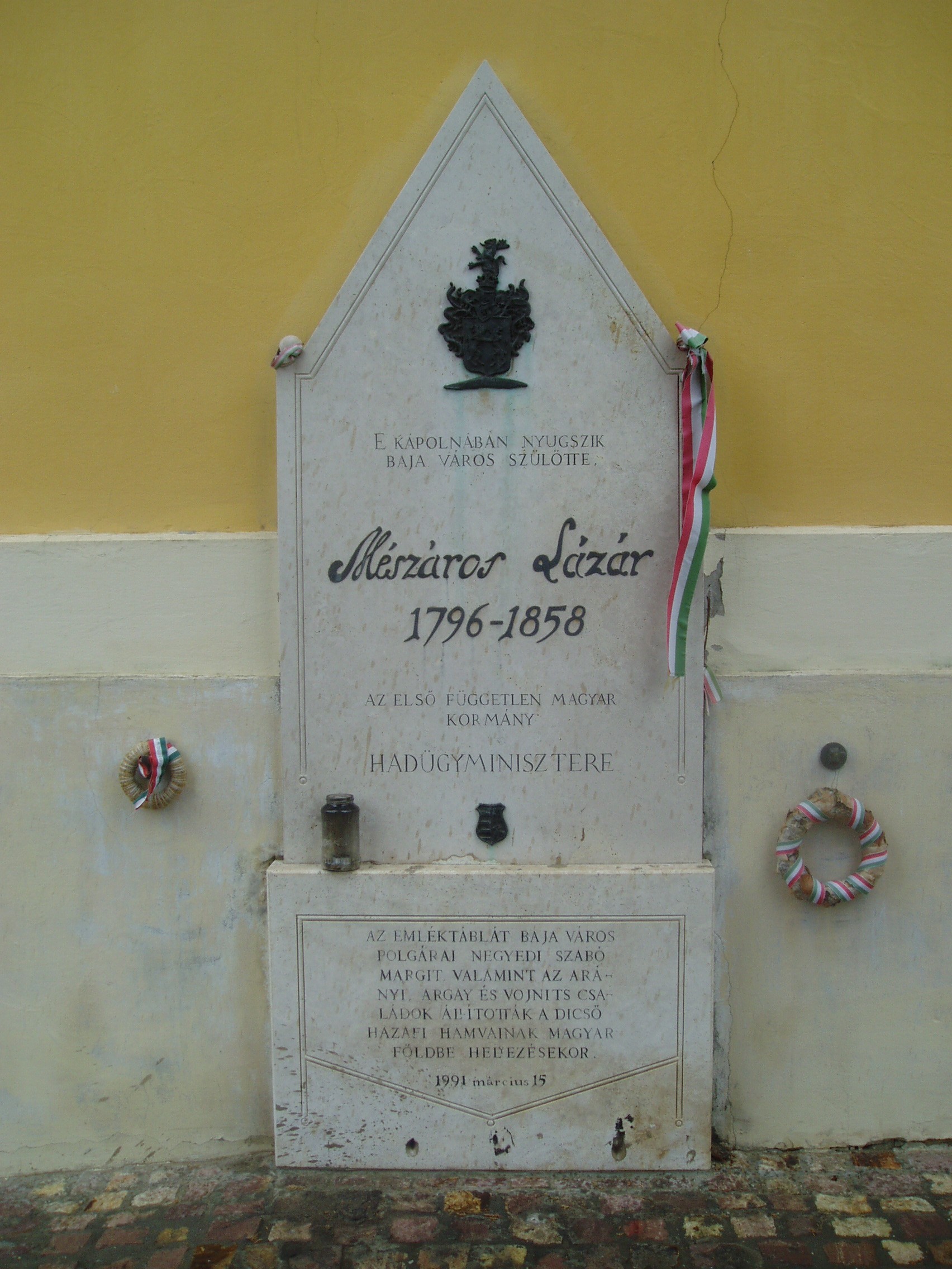 Nyilvános 1146 | 2355 | Baja, Rókus utca: Rókus temető - Mészáros Lázár | A hatalmas gesztenyefák által díszített Rókus utca elején találjuk a Rókus temetőt. A temetőkápolna oldalánál állították fel a kápolnában nyugvó Mészáros Lázár emléktábláját. Mészáros Lázár (1796-1858), az első felelős magyar kormány hadügyminisztere, altábornagy és Baja képviselője Baján született (lásd: Baja, Vörösmarty u. 6.). 1849 augusztusától emigrációban élt Törökországban, majd az Egyesült Államokban. Anglia és Skócia határvidékén, egy Eywood nevű településen hunyt el 1858. november 16-án, ahol látogatóban járt a szintén emigráns Teleki Sándor gróf anyósának birtokán. Ott is temették el. Az Európai Utas 2003/4. számában Sárközi Mátyás írta le, hogy mintegy negyven évvel korábban hogyan találta meg a sírt a birtokhoz tartozó Titley nevű helység temetőjében. Rögtön felmerült a hamvak hazahozatalának gondolata, de azt az Amerikában élő leszármazottak csak a rendszerváltás után engedélyezték. Végül Mészáros Lázár hamvait 1991. március 15-én helyezték végső nyugalomra szülővárosában. A fénykép 2007 októberében készült. Felh. irod.: Sárközi Mátyás: Honvédsír esőben. = Európai Utas 2003. 4. www.baja.hu Magyar életrajzi lexikon |