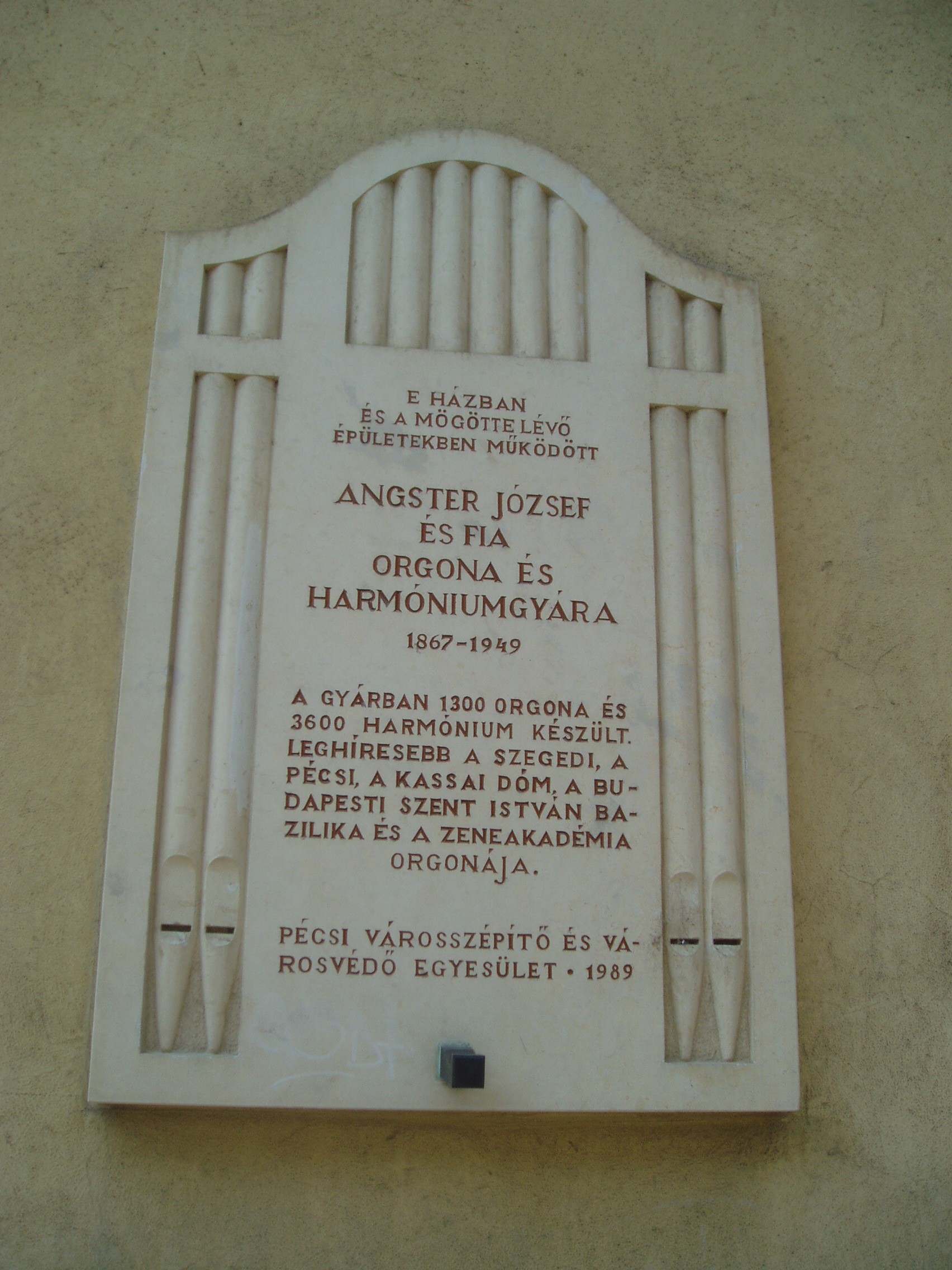 Nyilvános 1139 | 1803 | Pécs, Mária utca 35. | Fénykorában itt, és a környező épületekben működött az Angster orgonagyár. Alapítója, Angster József (1834–1918) nem született bele a szakmába. Eszéki asztalos–tanoncként töltött évek után Bécsben tanulta a hangszerkészítő szakmát. Tudását Párizsban tökéletesítette a világhírű Cavaillé–Coll orgonagyárban, ahonnét az akkor elérhető legmagasabb képzettséggel érkezett haza. Saját gyárának megalapítása után az első kimagasló szakmai sikert a kalocsai székesegyház (lásd: Kalocsa, Szentháromság tér) számára megépített orgonája hozta meg számára. Az orgonaüzem többször költözött, mert a megrendelések szaporodása miatt egyre nagyobb helyre lett szüksége. A József utcába való költözés jelentette a végleges telephely kialakításának első lépését. A gyártelepet 1891-ben tovább bővítették a József utcával párhuzamos Mária utcában levő 35. számú épülettel; ezen a házon látható az 1989-ben felavatott emléktábla. A századfordulón a kitűnő Angster–orgonák már szinte benépesítették a Kárpát–medencét, sőt eljutottak az akkori határokon túlra is. A fejlődés kiemelkedő lépcsőfoka volt a pécsi Belvárosi plébániatemplom (lásd: Pécs, Széchenyi tér) orgonájának ünnepélyes felavatása 1886-ban. Közben Angster József fiai, Emil és Oszkár is bekapcsolódtak a munkába, és apjuk 1918-ban ebben a házban bekövetkezett halála után ők vezették a céget. olyan hangszerek születtek, mint a budapesti Zeneakadémia orgonája 1925-ben és a szegedi Fogadalmi templom hatalmas hangszere. 1940-ben a harmadik Angster–generáció vette át a vezetést: Angster József és Imre. Az ő háborús idejükben is megtartotta hírét az üzem, de 1949. december 28-án bekövetkezett az államosítás, a fokozatos megszüntetés, a vezetők meghurcolása és a berendezések kiselejtezése. Napjainkban az Angster–hagyomány a tudomány síkján a stuttgarti Fraunhofer tudományos intézetben Angster Judit és férje, Miklós András révén, a gyakorlatban pedig az 1992 óta működő Pécsi Orgonaépítő Manufaktúra (Pécs, Buzsáki utca 37.) munkájában folytatódik. A fénykép 2006 júliusában készült. Felh. irod.: Angster József: Az Angster-család és az Angster Orgonagyár történetéből. = Angstertől Zsolnayig. Ipartörténeti tanulmányok. Pécs, 1999 |