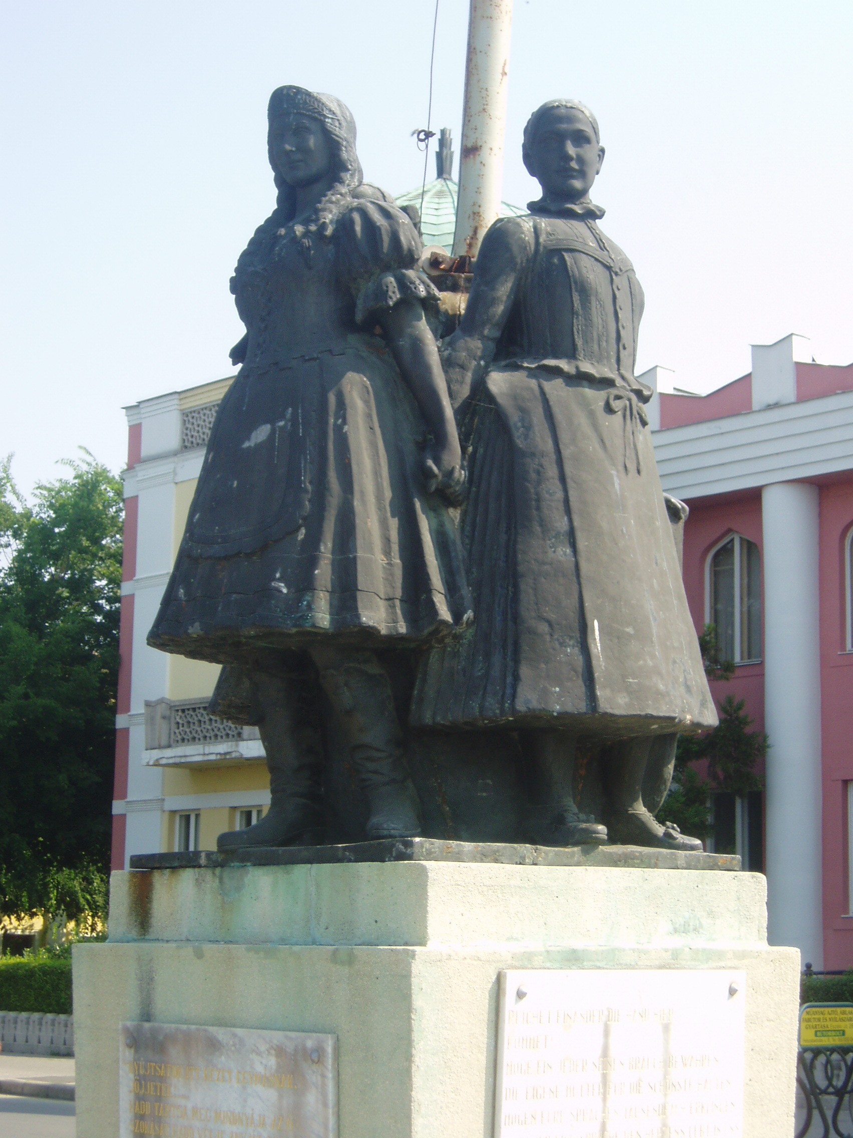 Nyilvános 1847 | 3714 | Rövid leírás | Teljes leírás (1.1 KB) | Mohács, Széchenyi tér A Széchenyi tér a város fő tere, középpontjában emelkedik a Fogadalmi templom, keleti oldalán pedig az 1926-ban, a mohácsi csata 400. évfordulója alkalmából Árkay Aladár tervei szerint épített városháza. A városháza előtt 1932-ben állították fel Martinelli Jenő harmonikus szoborkompozícióját: a sokác, magyar és német népviseletbe öltözött lányok szoboralakja a nemzetiségek békés egymás mellett élése szimbólumaként fogja egymás kezét. A szobor talapzatán a nagy német drámaíró és költő, G. E. Lessing versrészlete olvasható: „Nyújtsatok itt kezet egymásnak, jöjjetek! Hadd tartsa meg mindnyája az ő szokását, Hadd vélje anyját szebbnek mindenkinél. Hadd járjon azután a nyelvetek ezer felé. A szívnek csakis egy nyelve van közöttünk!” A fénykép 2006 júliusában készült. Felh. irod.: Látnivalók Pécsett és Baranyában. Miskolc, Well-PRess, 1998 www.mohacs.hu www.vendegvaro.hu |
