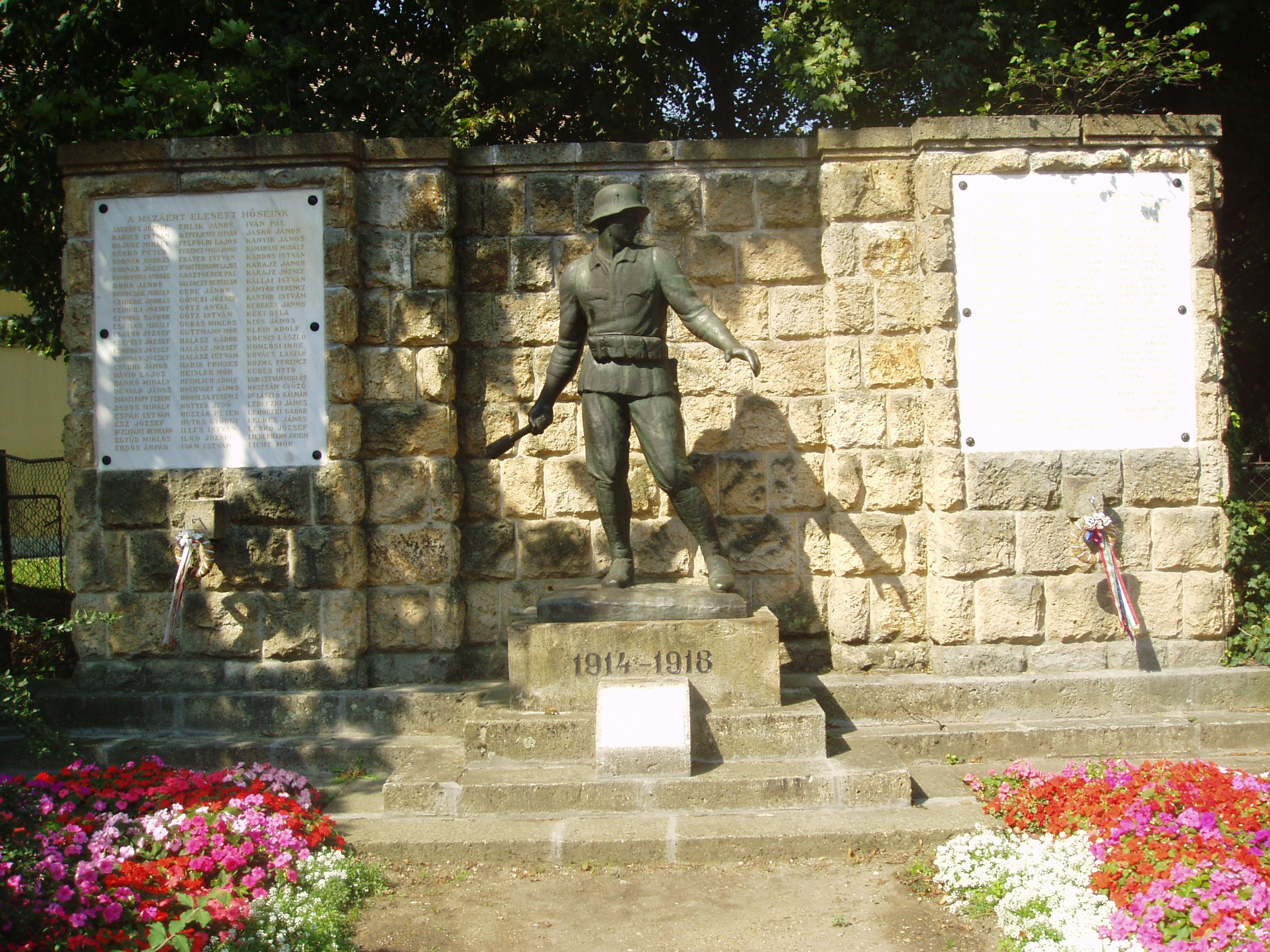 Nyilvános 1496 | 3790 | Sárospatak, Iskolakert bejárat: I. világháborús emlékmű | A Református Kollégium (lásd: Sárospatak, Rákóczi u. 1.) bejáratával szemben találjuk a hét hektáros Iskolakertet. Bejáratát két emlékmű fogja közre. A Táncsics utca felőli oldalon áll az I. világháború hőseinek emlékét idéző, gránátot dobó honvéd bronzszobra. Medgyessy Ferenc alkotását 1935-ben leplezték le. A fénykép 2007 augusztusában készült. Felh. irod.: www.vendegvaro.hu |
