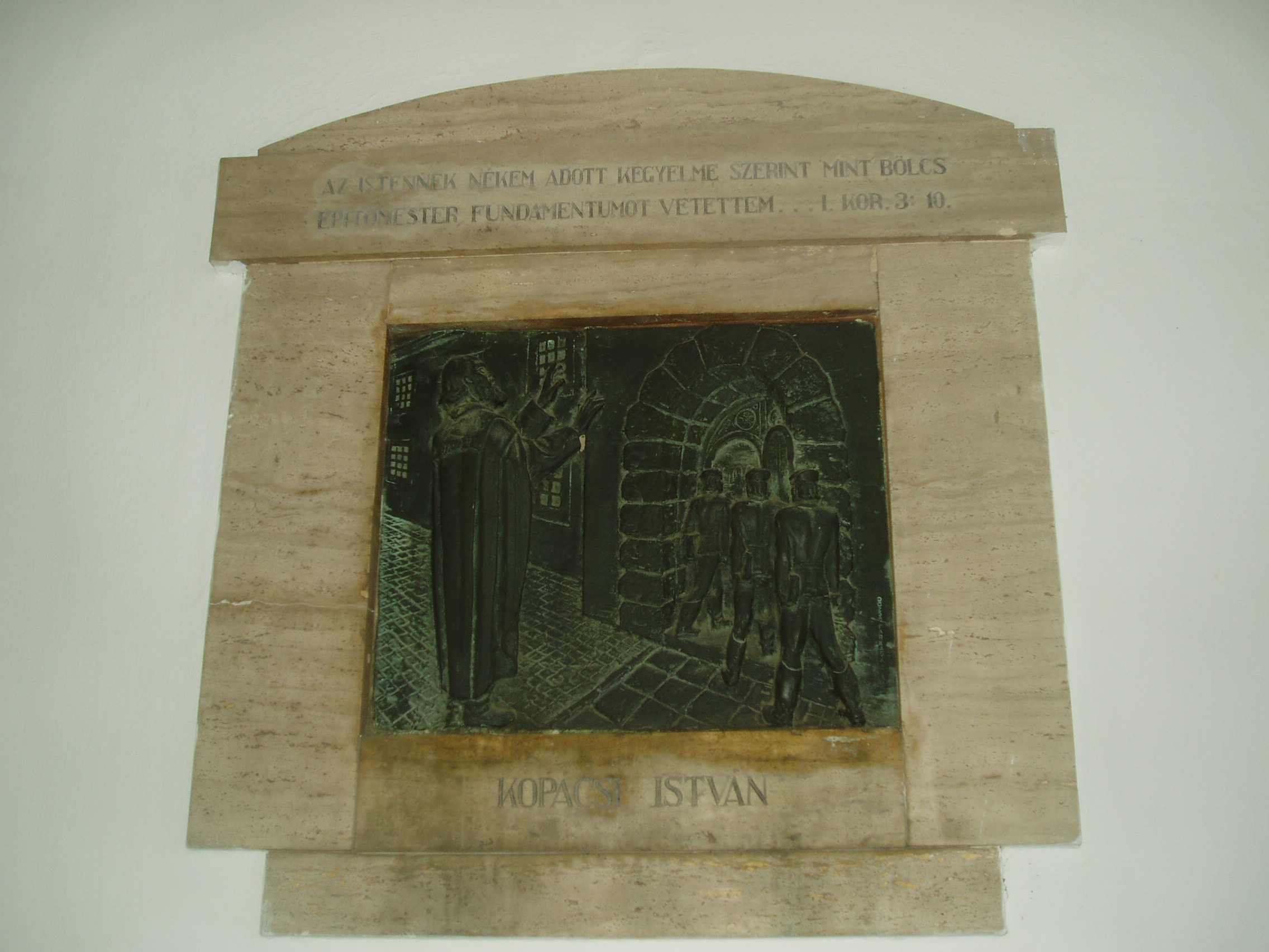 Nyilvános 1088 | 1544 | Sárospatak, Rákóczi utca 1. Református Kollégium | A kollégium főépülete, a Nagy Kollégium a Rákóczi út északi végén található, mely 1804–1814 között korai klasszicista stílusban épült. Szép ráccsal ellátott, háromíves nyílású kapuzat vezet be az un. „nagyportá”-ba, amelyet két sor vaskos pillér három hajóra oszt. Kétoldalt a falakon az iskolatörténet néhány fontosabb eseményének, illetve a kollégium nagy alakjainak bronz domborművű ábrázolásait helyezték el. A képen Kopácsi István domborműve látható. Kopácsi István ferences rendi szerzetes volt, őt állította az 1531-ben alapított református iskola élére Perényi Péter, Patak földesura. Az 1937-ben felavatott dombormű alkotója Dózsa Farkas András. A fénykép 2007 augusztusában készült. Felh. irod.: Détsy Mihály: Sárospatak. Bp. Corvina, 1974 Látnivalók Borsod-Abaúj-Zemplén megyében. Miskolc, Well-PRess, 1995 www.sarospatak.hu/nevezetessegek |