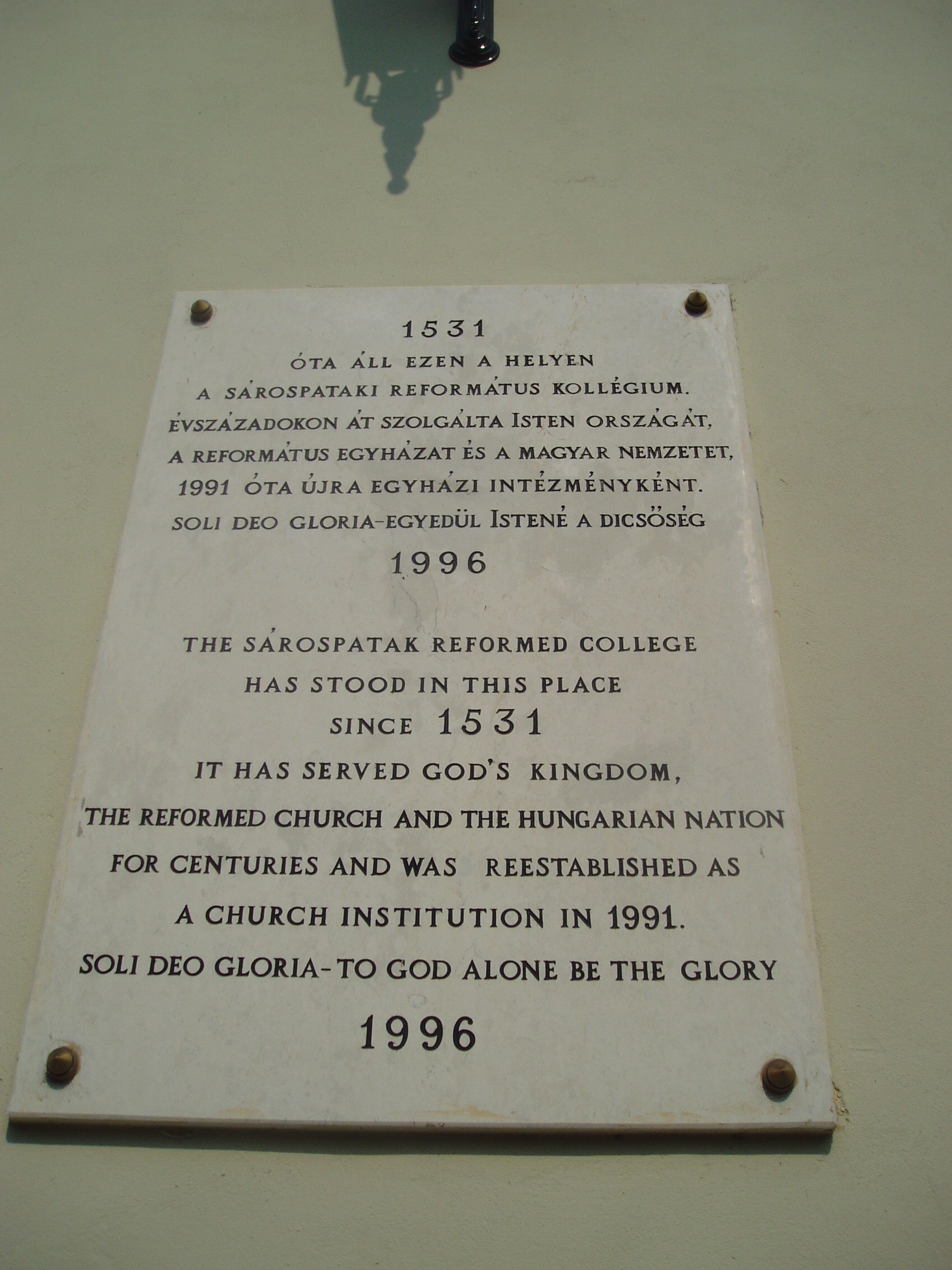 Nyilvános 1084 | 1572 | Sárospatak, Rákóczi utca 1. Református Kollégium | A kollégium főépülete, a Nagy Kollégium a Rákóczi út északi végén található, mely 1804–1814 között korai klasszicista stílusban épült. Szép ráccsal ellátott, háromíves nyílású kapuzat vezet be az un. „nagyportá”-ba, amelyet két sor vaskos pillér három hajóra oszt. Kétoldalt a falakon az iskolatörténet néhány fontosabb eseményének, illetve a kollégium nagy alakjainak bronz domborművű ábrázolásait helyezték el. Az 1996-ban állított feliratos tábla arról emlékezik meg, hogy a pataki kollégium 1531 óta áll ezen a helyen. A fénykép 2007 augusztusában készült. Felh. irod.: Détsy Mihály: Sárospatak. Bp. Corvina, 1974 Látnivalók Borsod-Abaúj-Zemplén megyében. Miskolc, Well-PRess, 1995 www.sarospatak.hu/nevezetessegek |