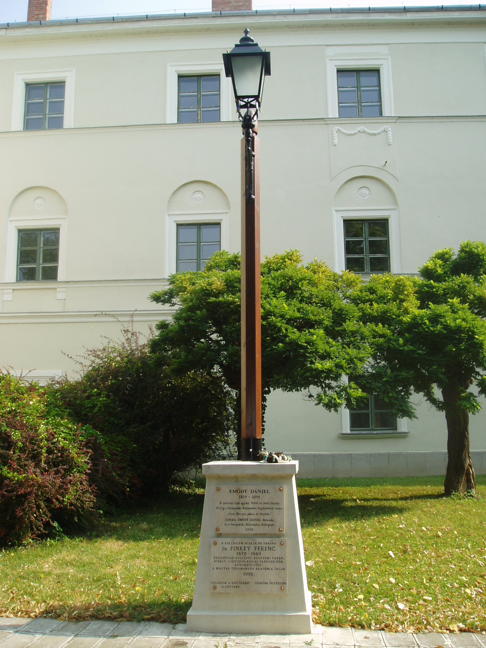 Nyilvános 1075 | 1595 | Sárospatak, Rákóczi utca 1. Református Kollégium | A kollégium főépülete, a Nagy Kollégium a Rákóczi út északi végén található, mely 1804–1814 között korai klasszicista stílusban épült. Szép ráccsal ellátott, háromíves nyílású kapuzaton át jut a látogató az udvarra. Az 1990-es évek közepétől helyeznek el emléktáblákat az itt felállított kandeláberek talapzatán. Az első emléktábla Emődy Dániel (1819-1891) alakját idézi. A márciusi ifjak egyike, Petőfi és Jókai barátja 28 évig volt a Református Jogakadémia tanára. A második táblát Dr. Finkey Ferenc (1870-1949) kiváló jogtudós, koronaügyész, egykori pataki diák emlékére állították. A fénykép 2007 augusztusában készült. Felh. irod.: Détsy Mihály: Sárospatak. Bp. Corvina, 1974 Látnivalók Borsod-Abaúj-Zemplén megyében. Miskolc, Well-PRess, 1995 www.sarospatak.hu/nevezetessegek |